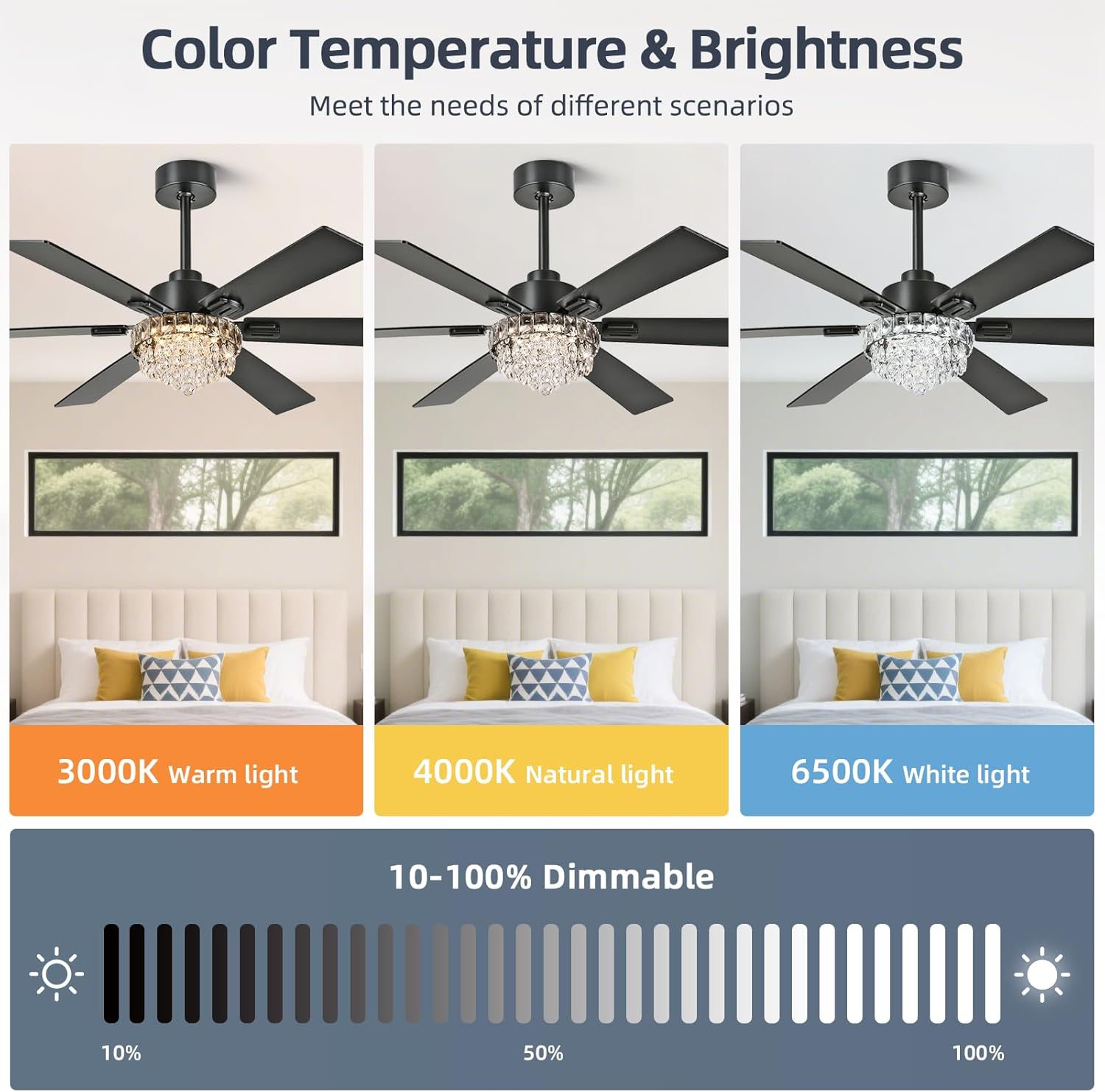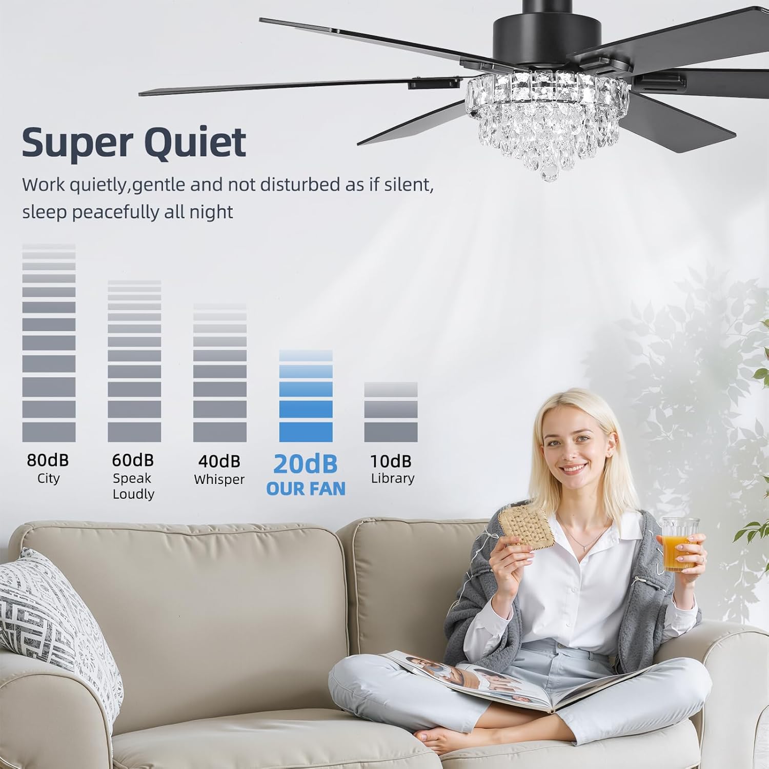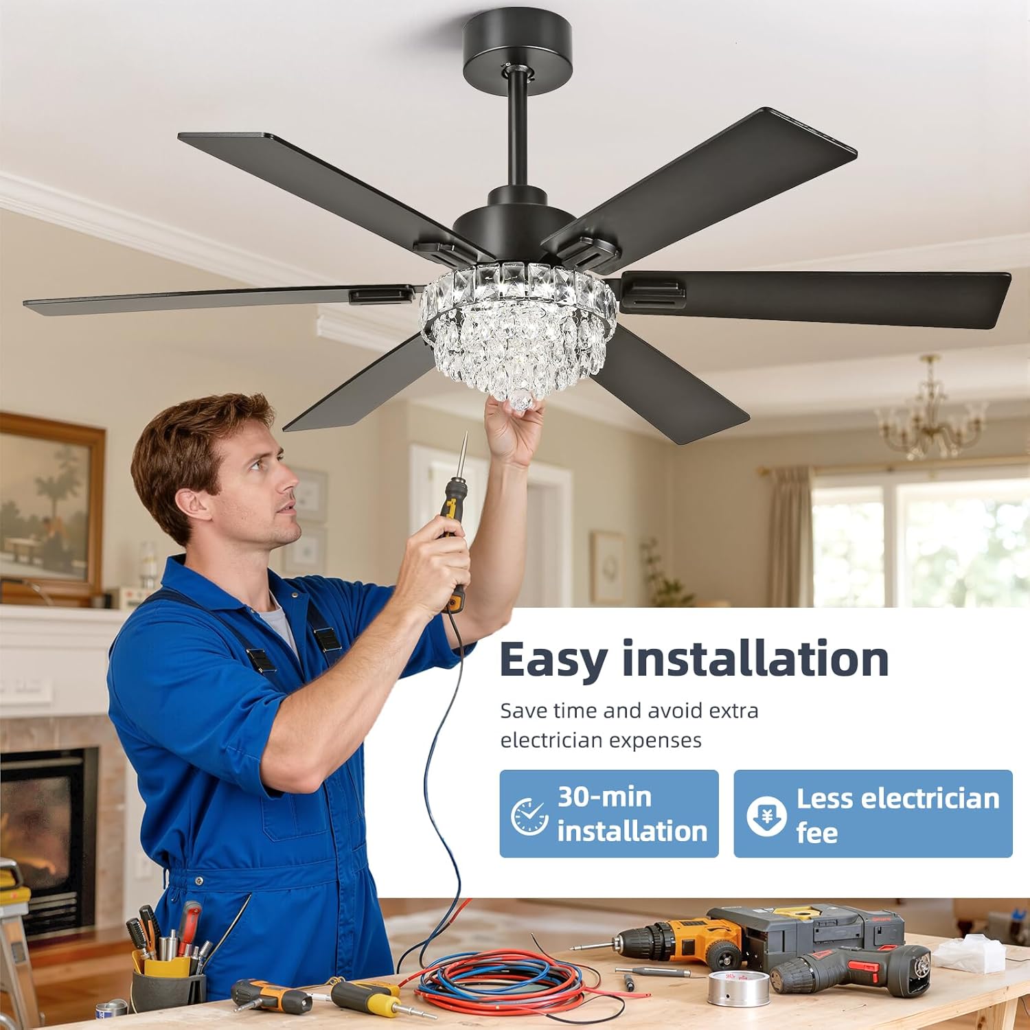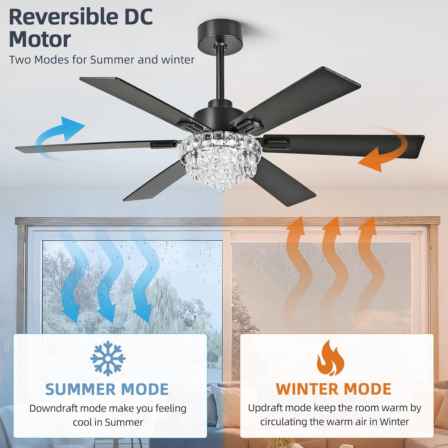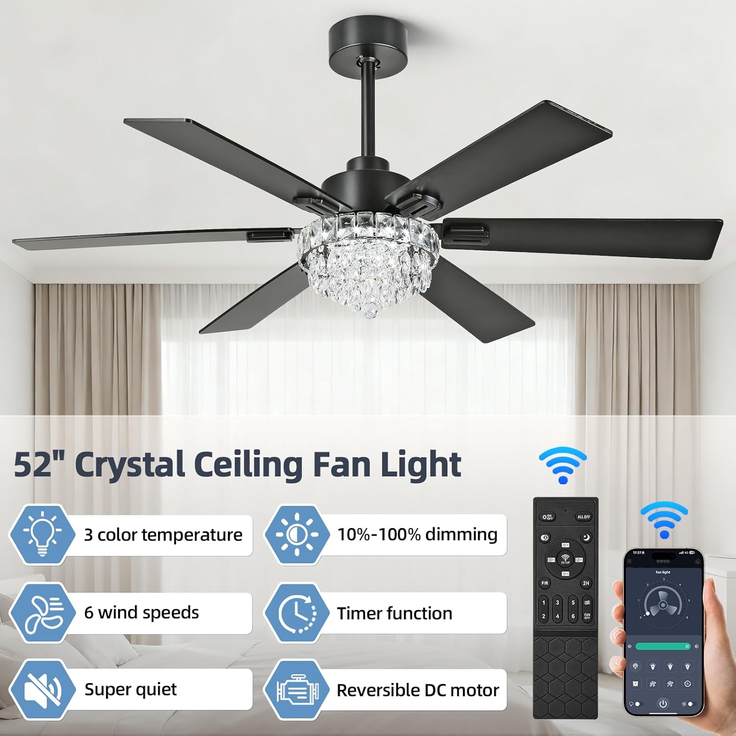 52 Inch Crystal Chandelier Ceiling Fan with Light, 6-Speed Remote Control Black Fandelier with Timer, 6 Reversible Blades Fan Chandelier for Living Room Bedroom, Dimmable LED Light, Quiet DC Motor