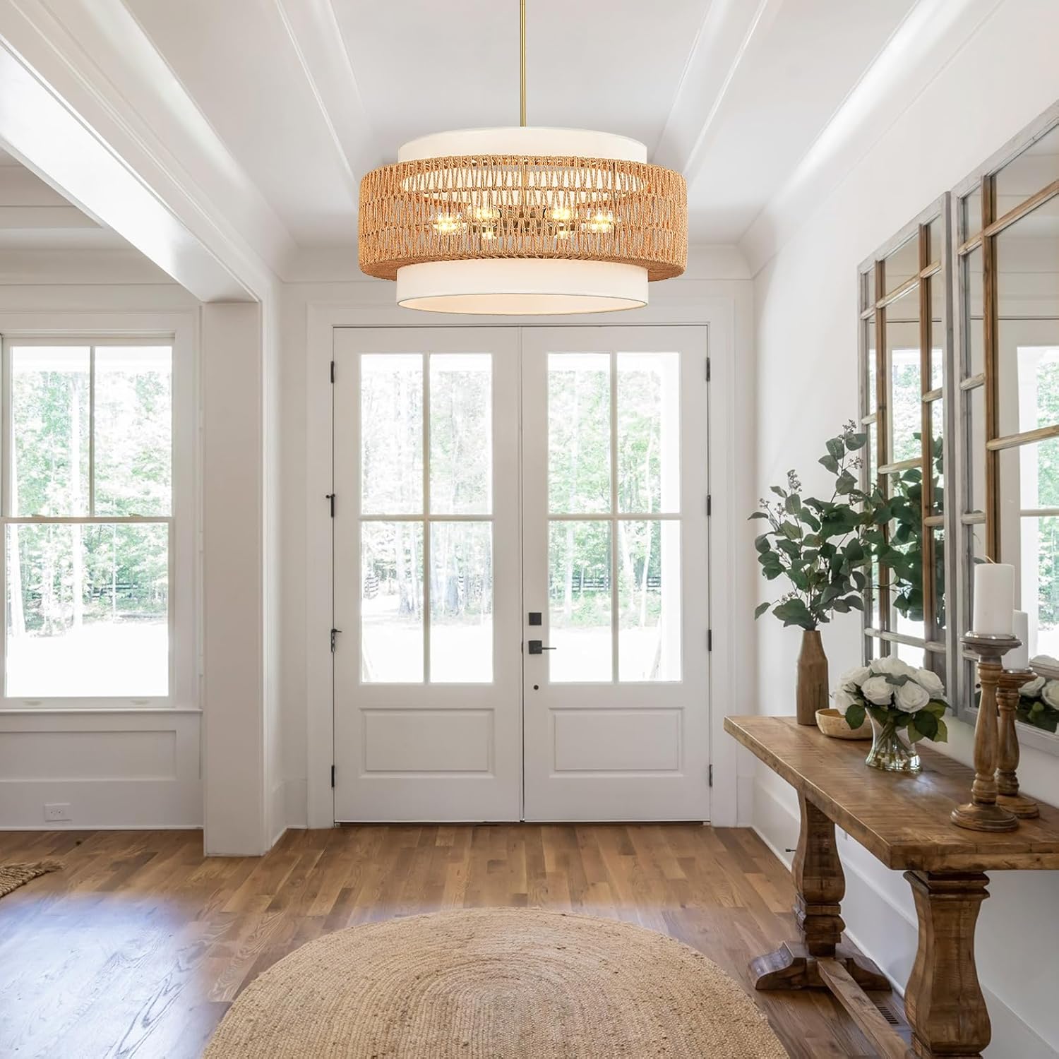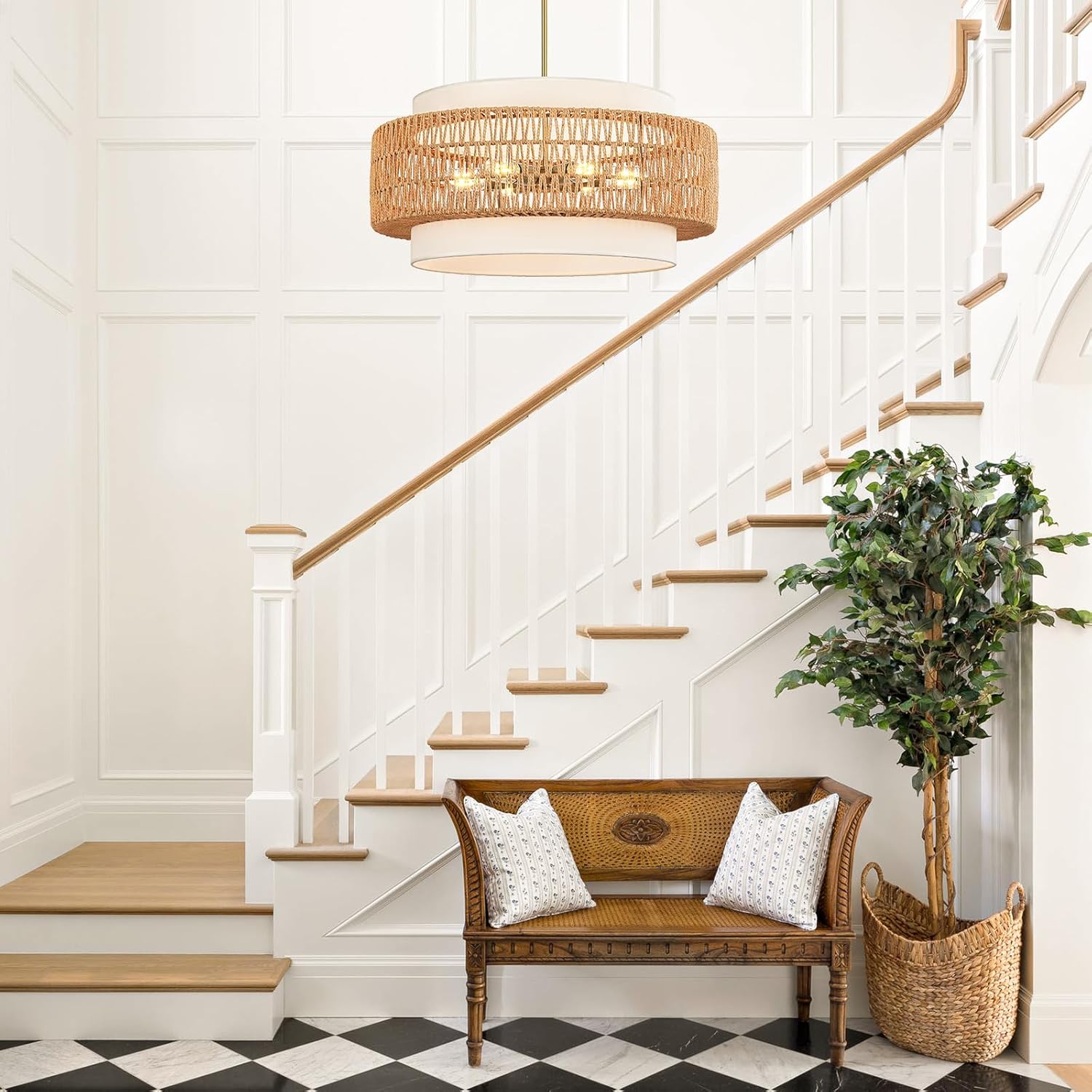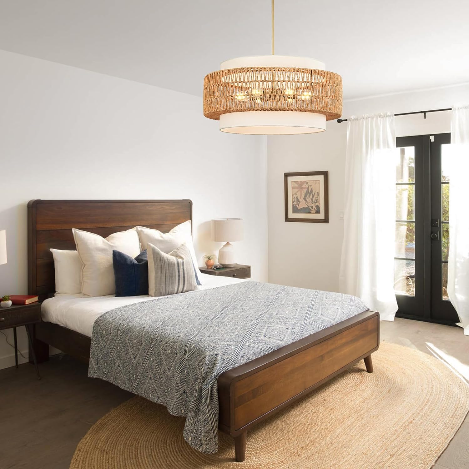 6-Light Boho Rattan Chandelier, 25.6″ Large Rattan Pendant Light with Fabric Shade, Farmhouse Hand Woven Chandelier Hanging Ceiling Light for Dining Room, Living Room, Kitchen Island, Foyer, Hallway