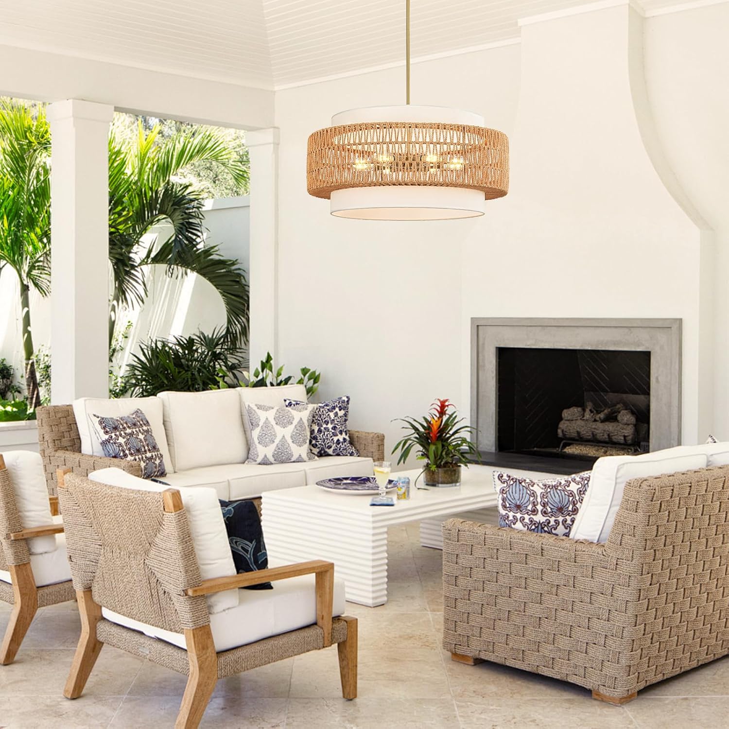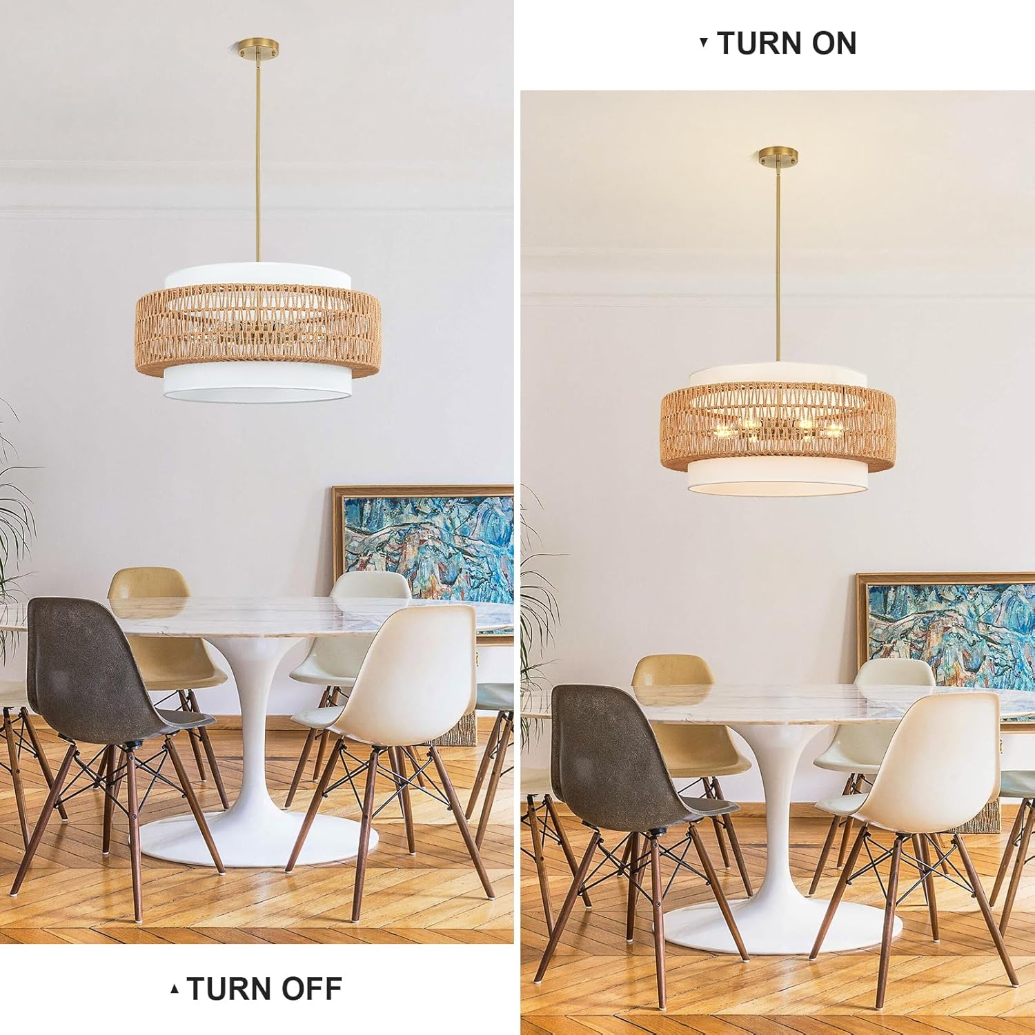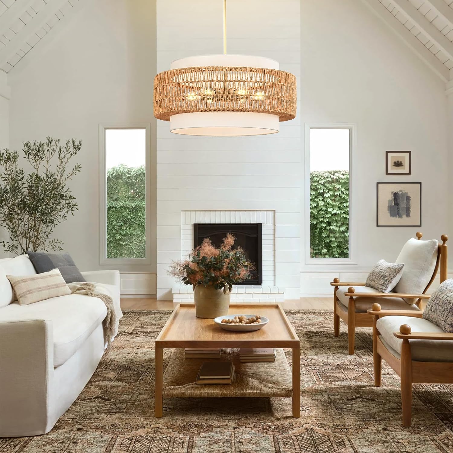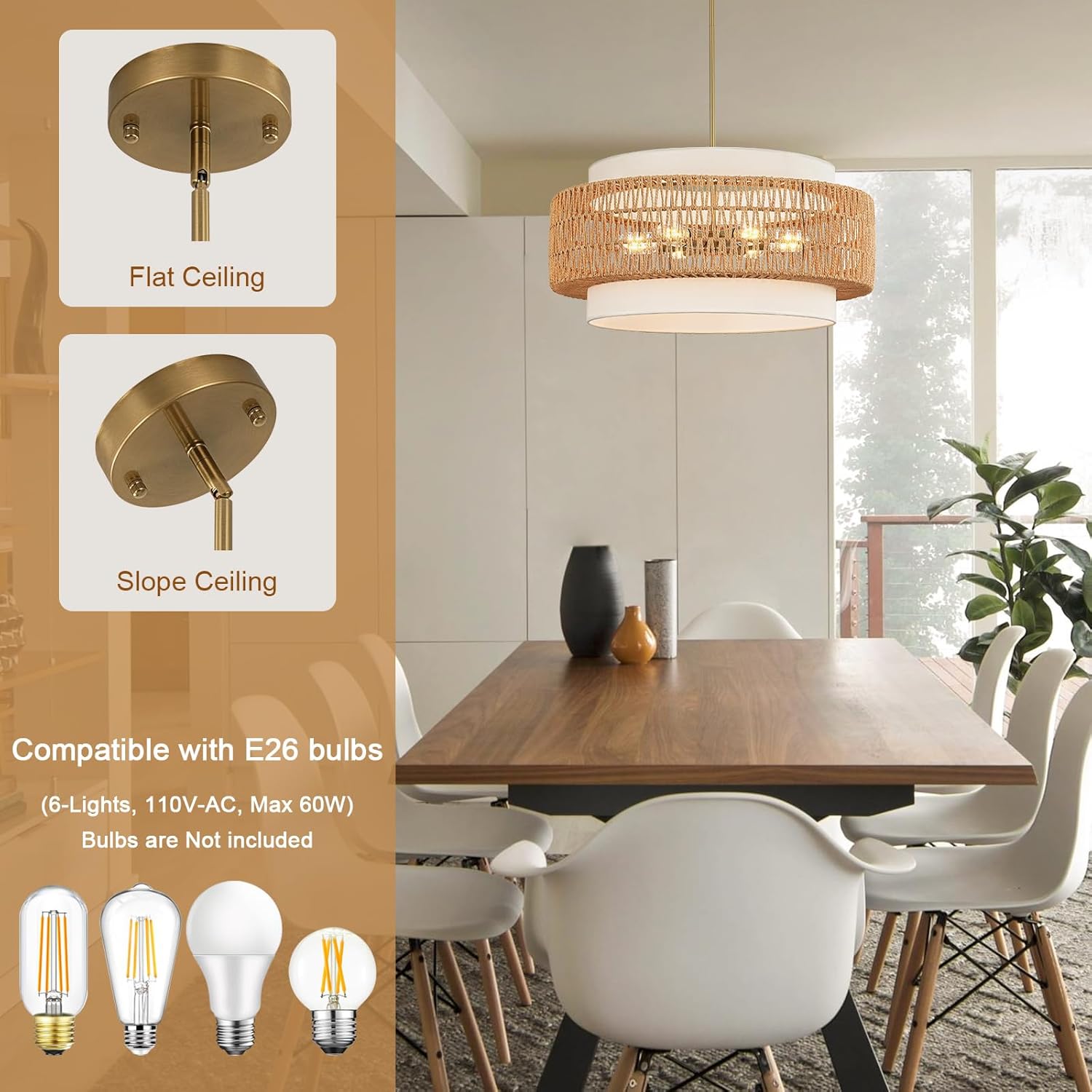 6-Light Boho Rattan Chandelier, 25.6″ Large Rattan Pendant Light with Fabric Shade, Farmhouse Hand Woven Chandelier Hanging Ceiling Light for Dining Room, Living Room, Kitchen Island, Foyer, Hallway