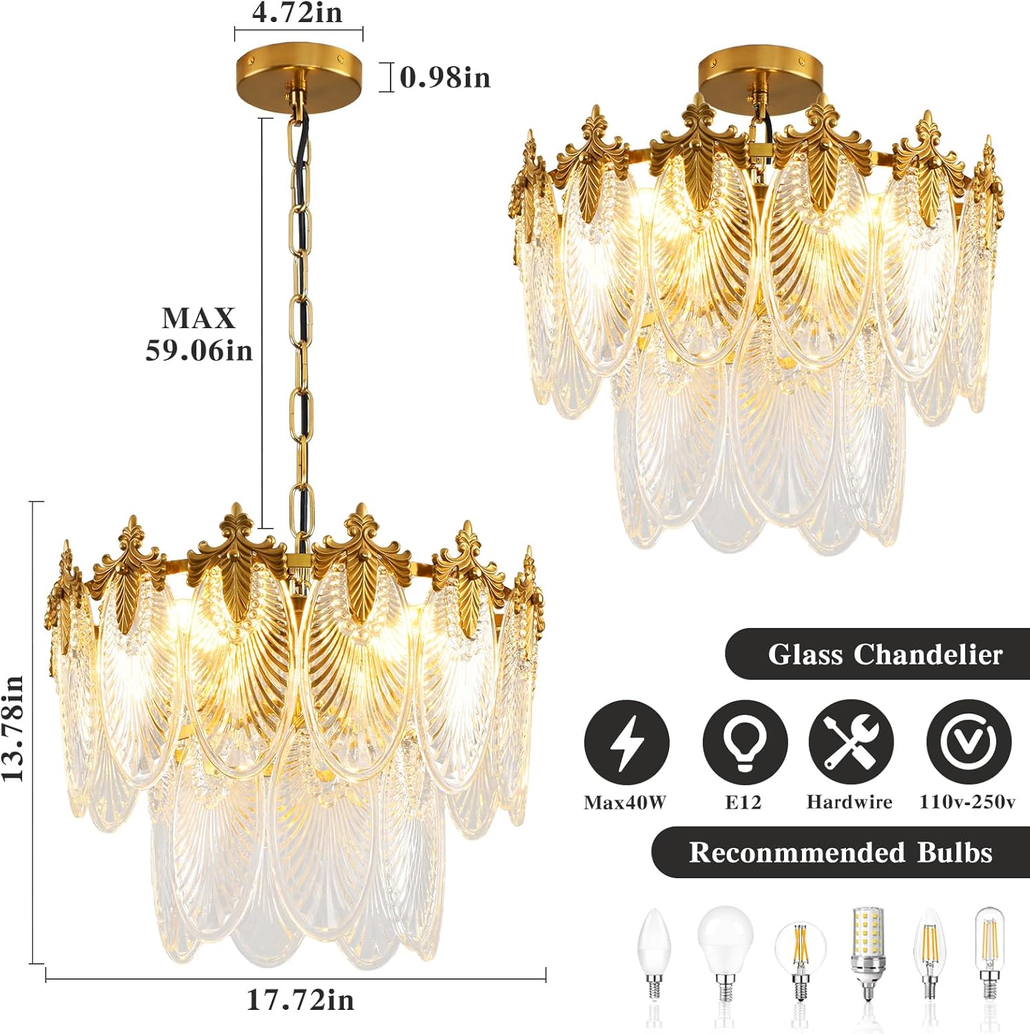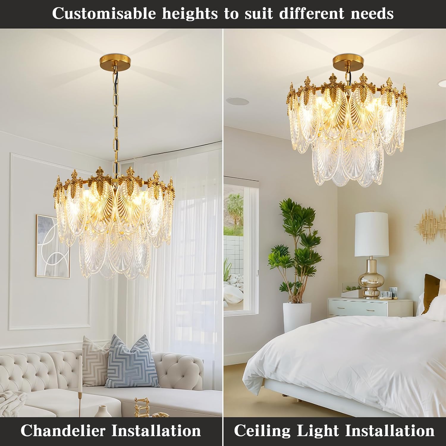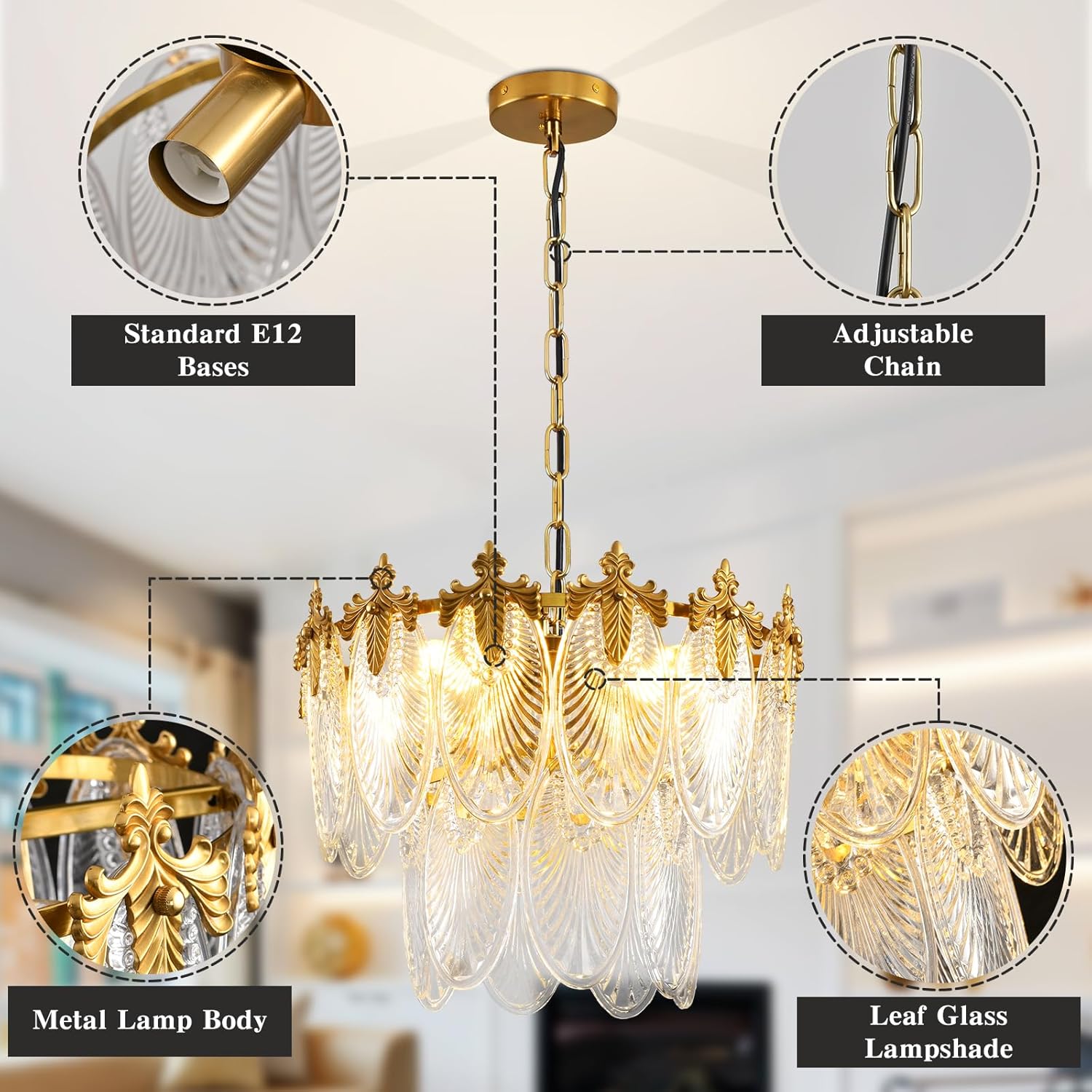 Antique Chandeliers 2-Layer Gold Crystal Glass Chandelier, 4-Light Round Pendant Light 17.7″ Brushed Brass Adjustable Height, Applicable to Dining Room, Bedroom, Living Room, Foyer, Kitchen Island