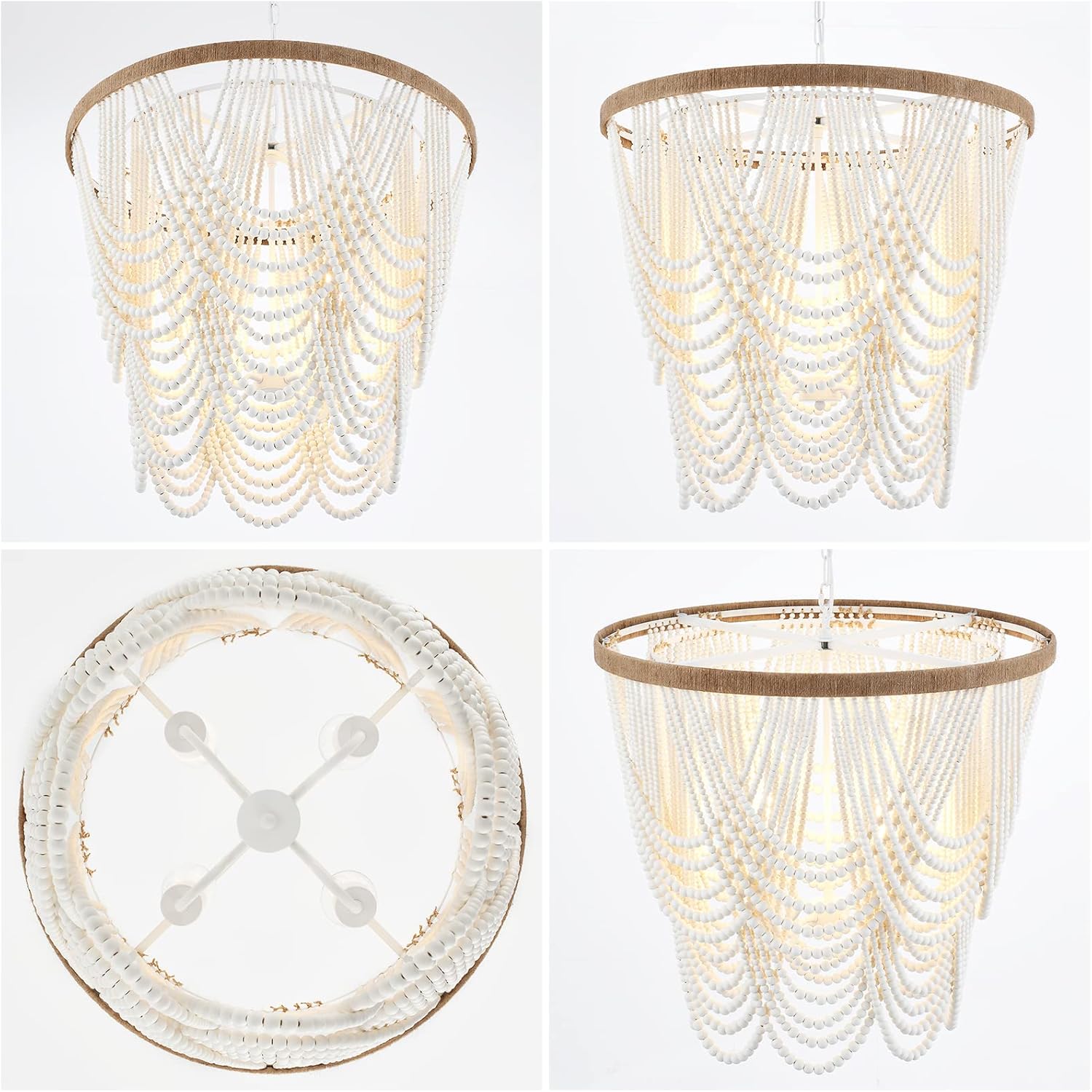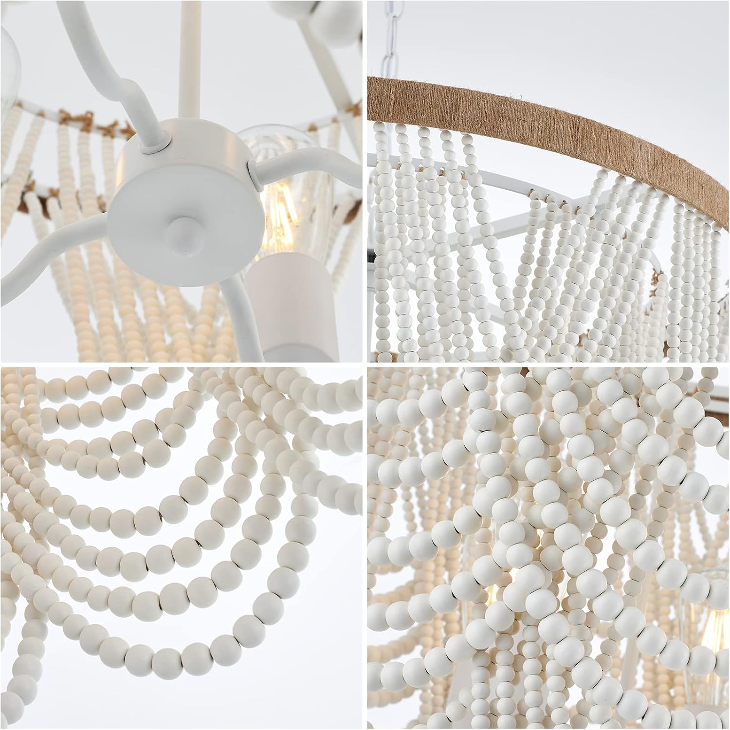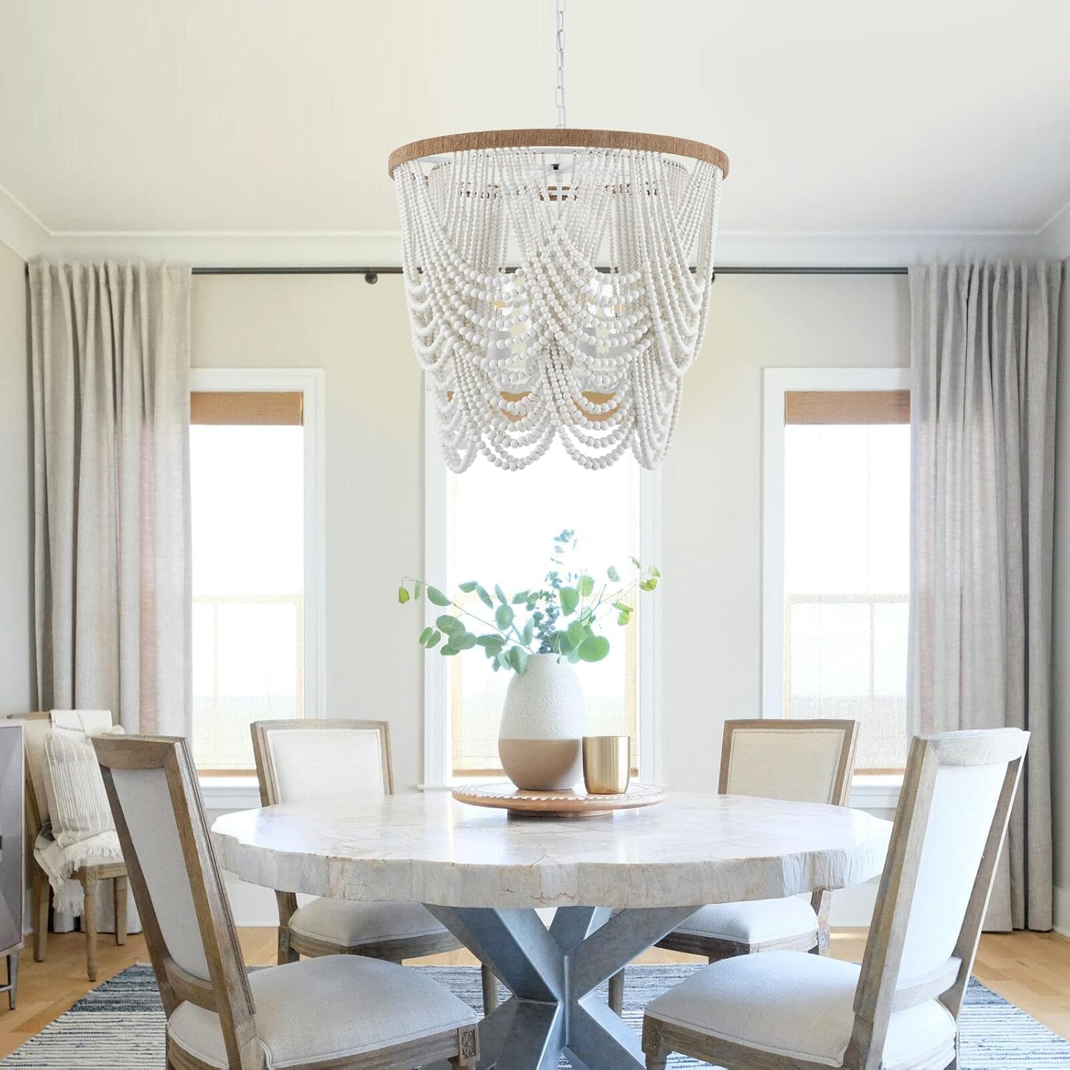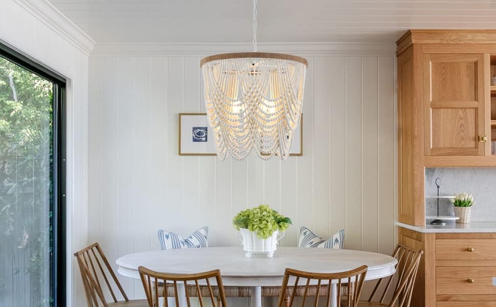 ELYCCUPA 26u201D Boho Wood Beaded Chandelier Rustic Farmhouse Pendant Light 4-Lights Large Coastal Chandelier for Living Room Dining Room Foyer Entryway Bedroom, Oak White, E26, UL Listed