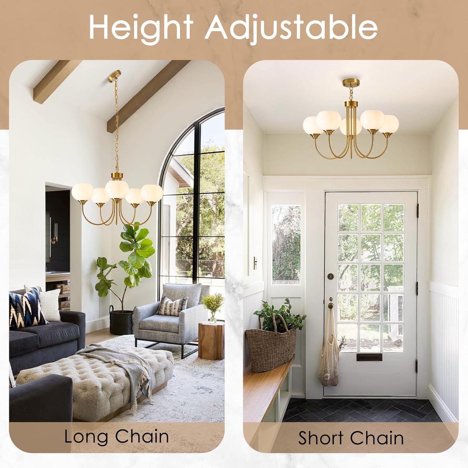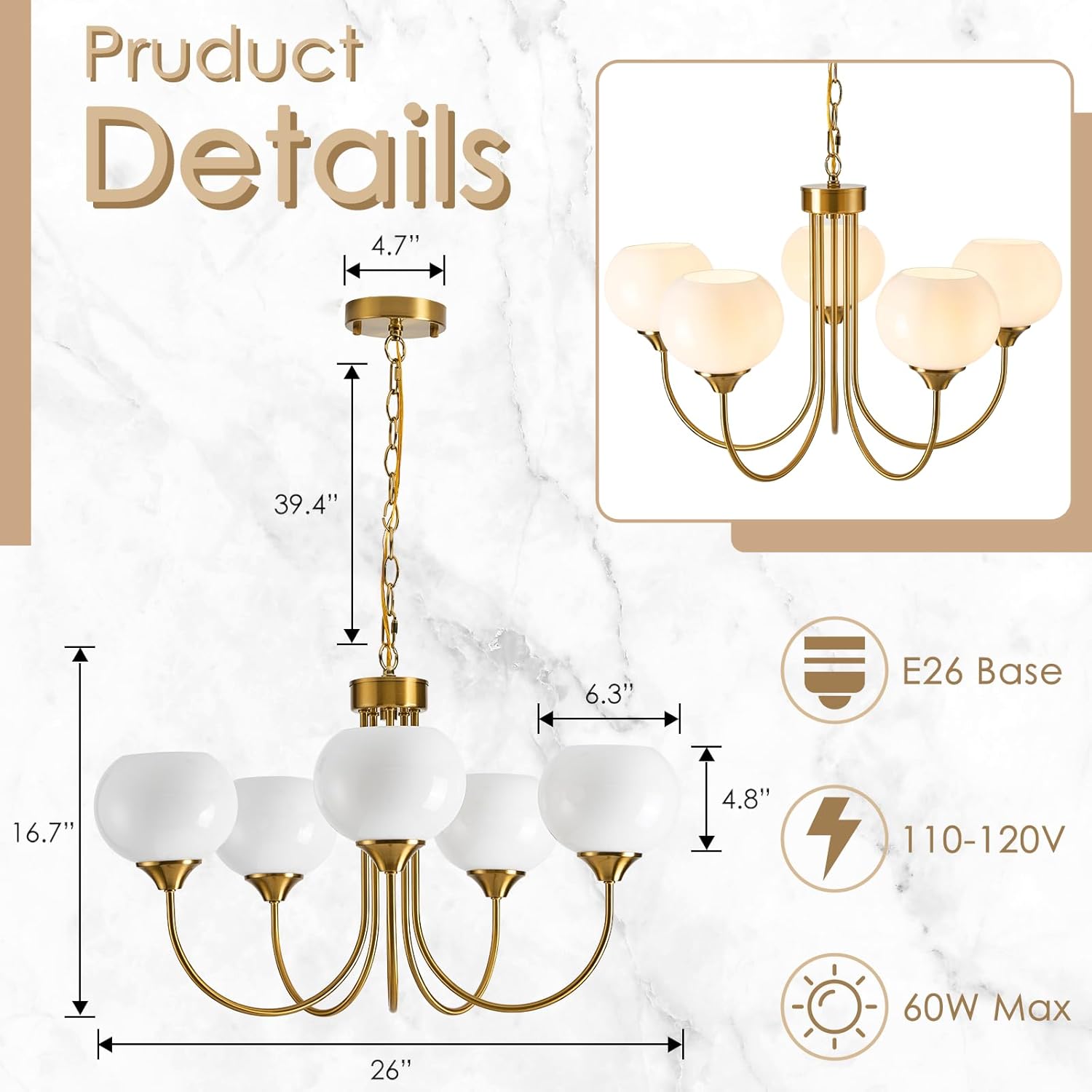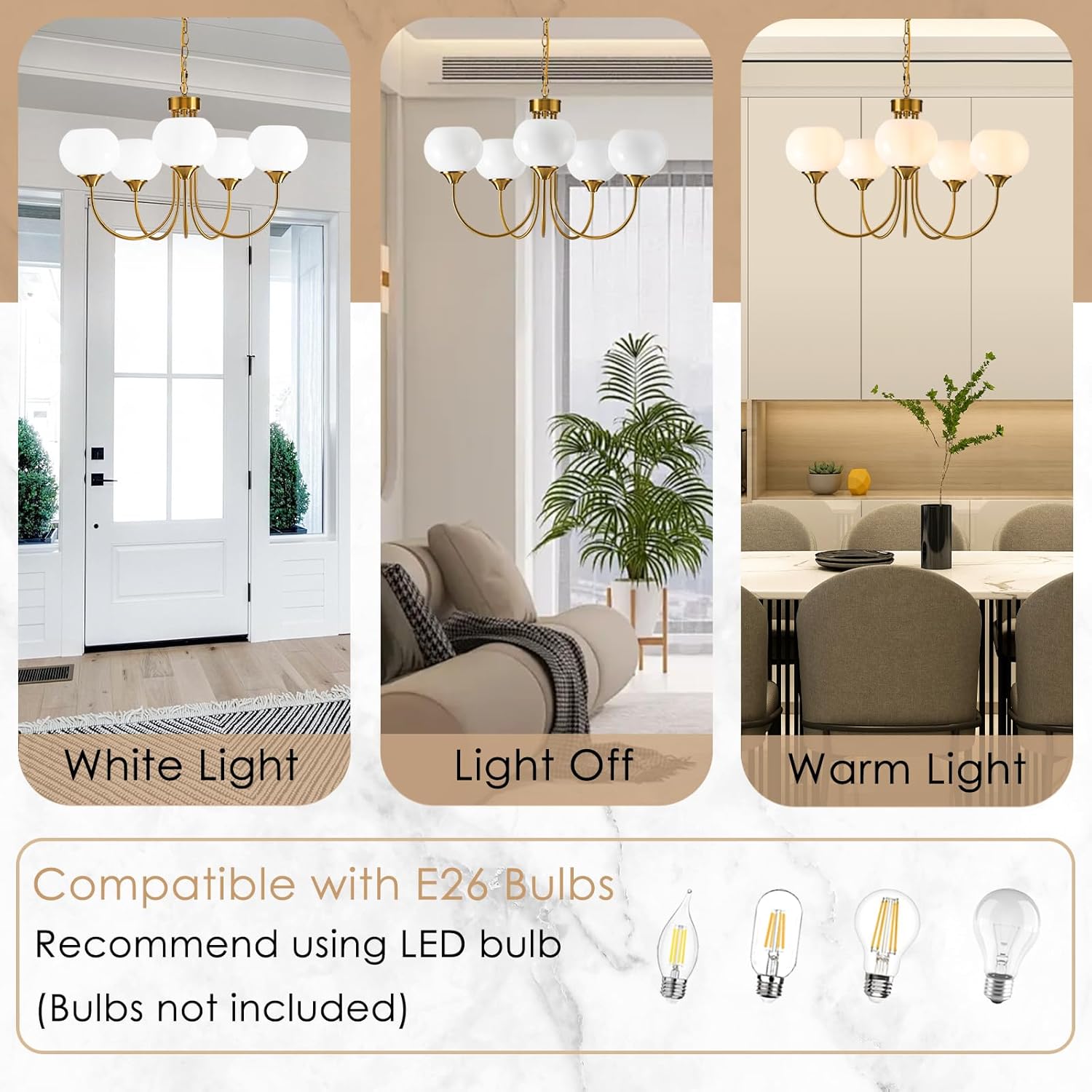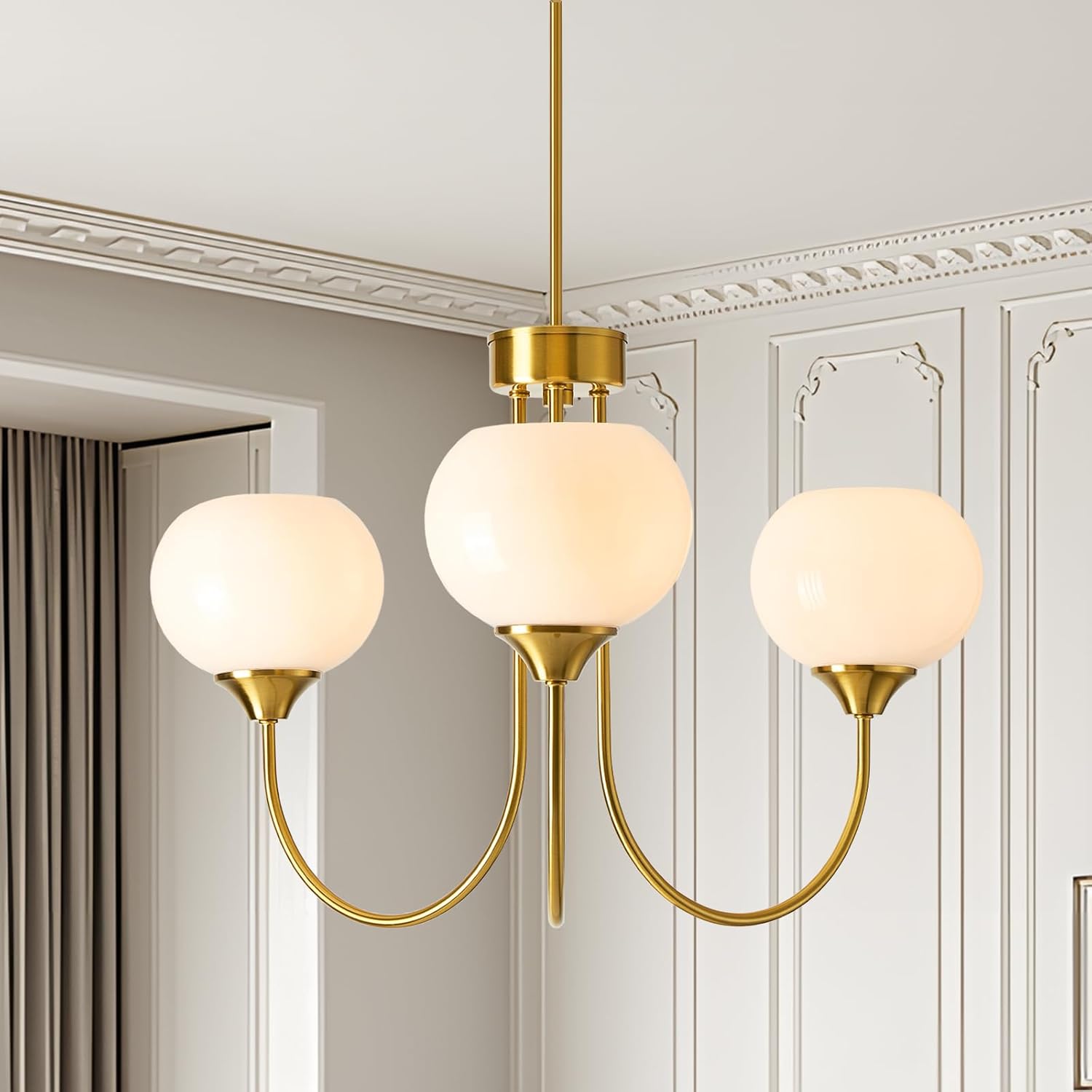 FEAZAC Modern Globe Chandelier 5 Light Mid Century White Milk Glass Vintage Sputnik Hanging Chandeliers Gold Pendant Light Fixtures for Dining Room Kitchen Living Room Bedroom