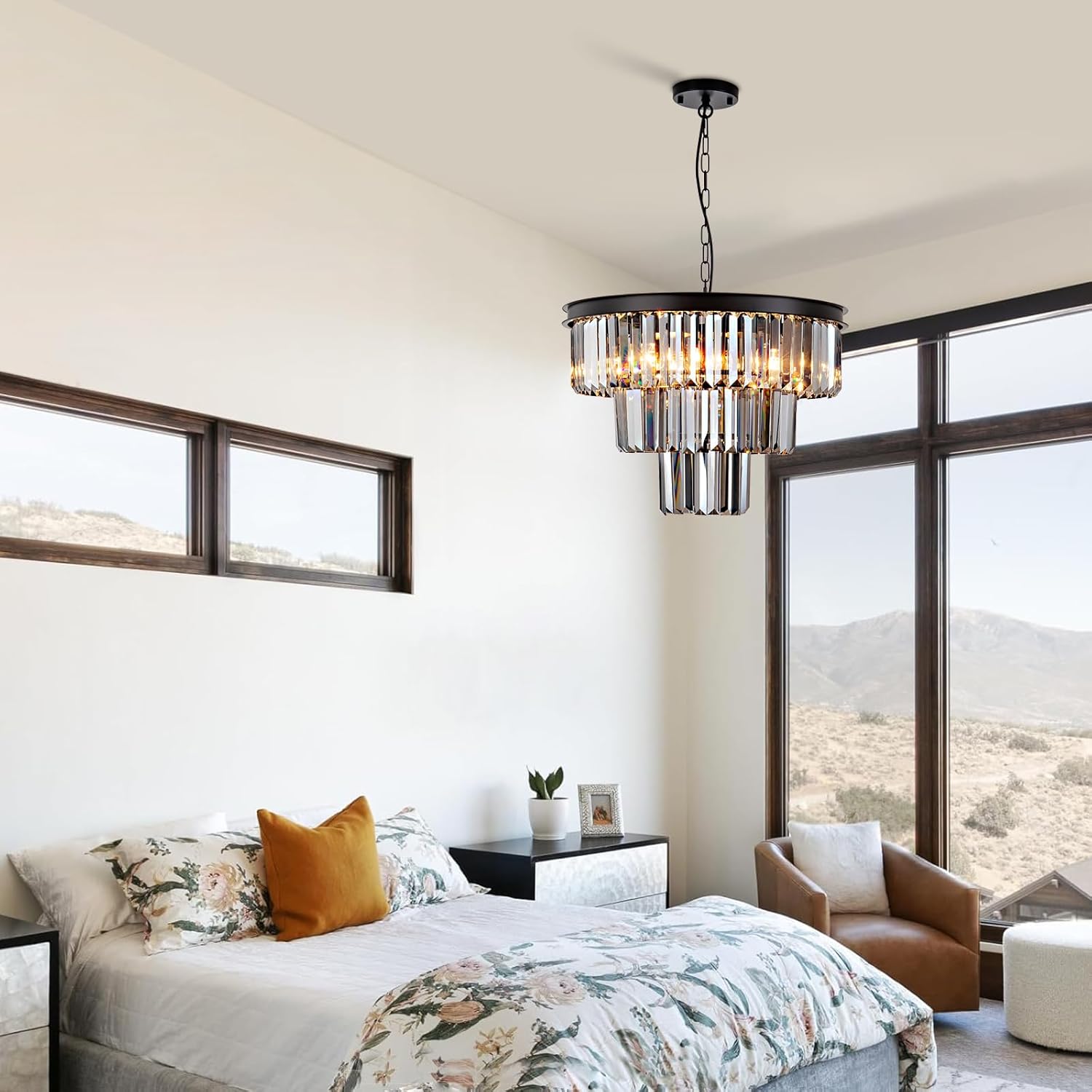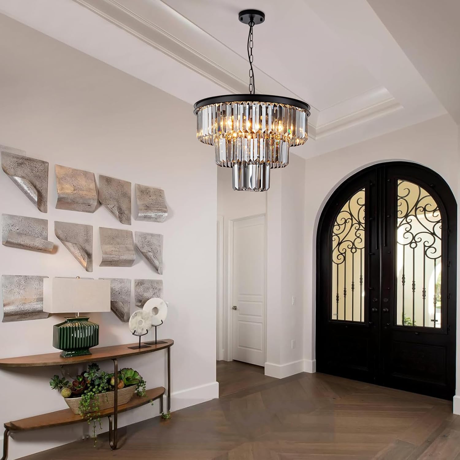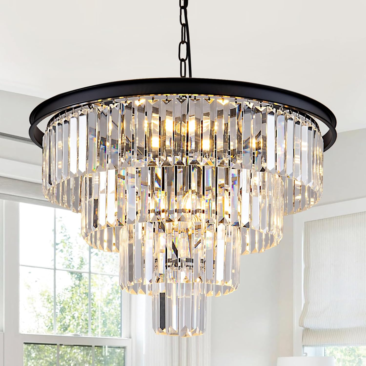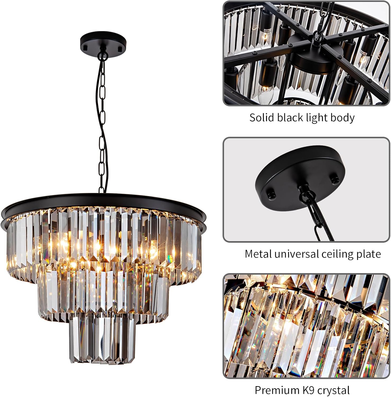 HCCZ 8 Light Black Crystal Chandelier 20” Luxury Smoke Modern Dining Room Light Fixture 3-Tier Round Hanging Pendant Ceiling Lighting for Entryway Foyer Living Room Adjustable Height E12