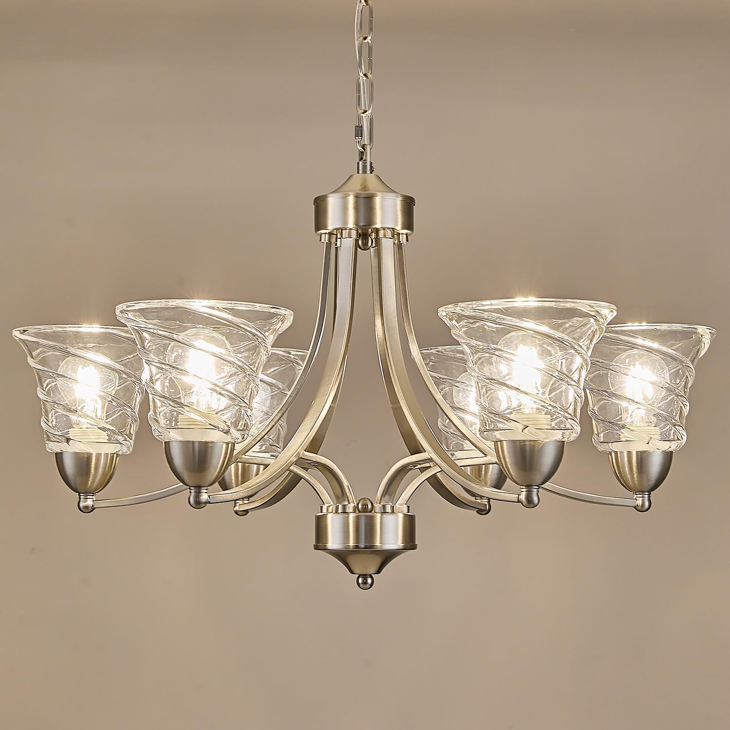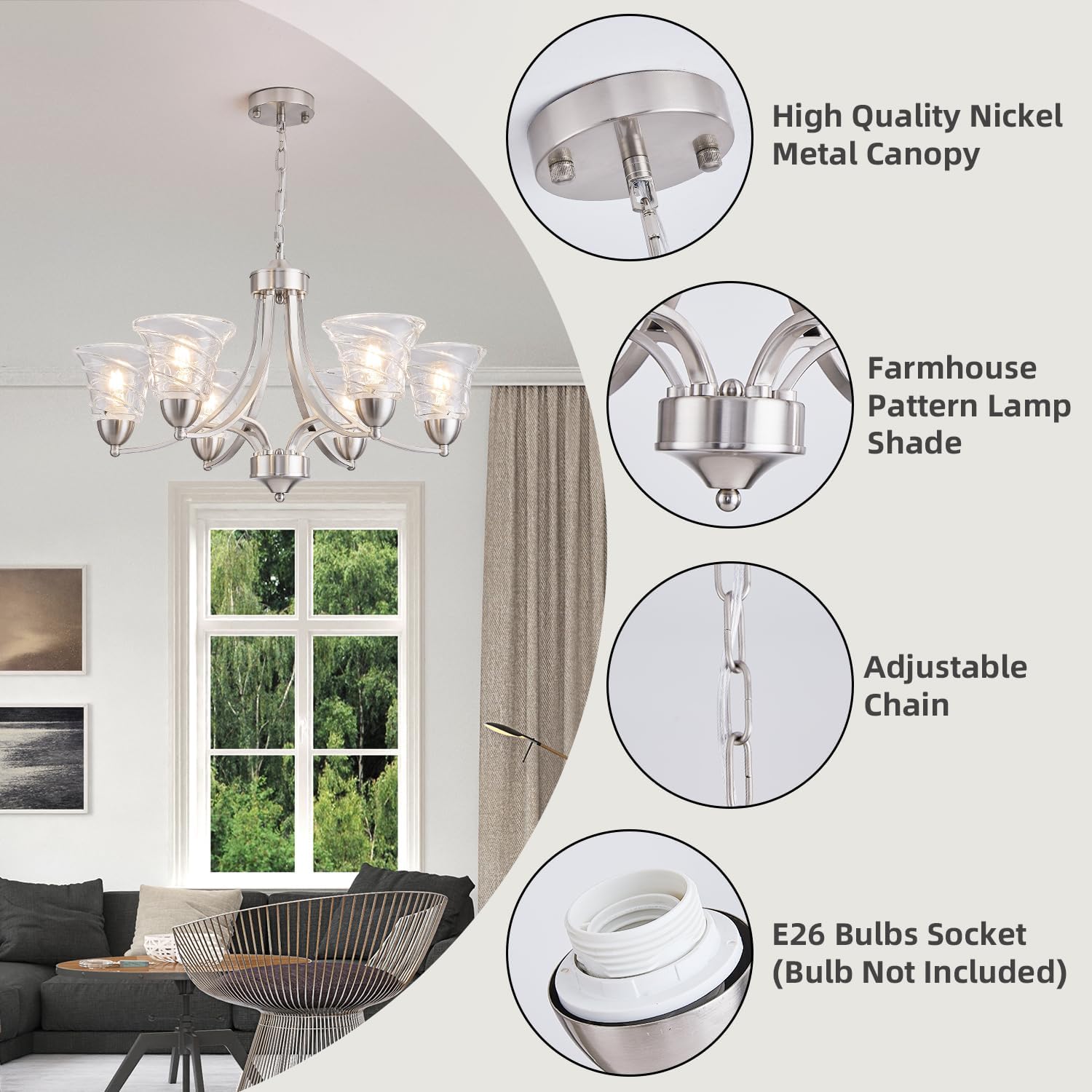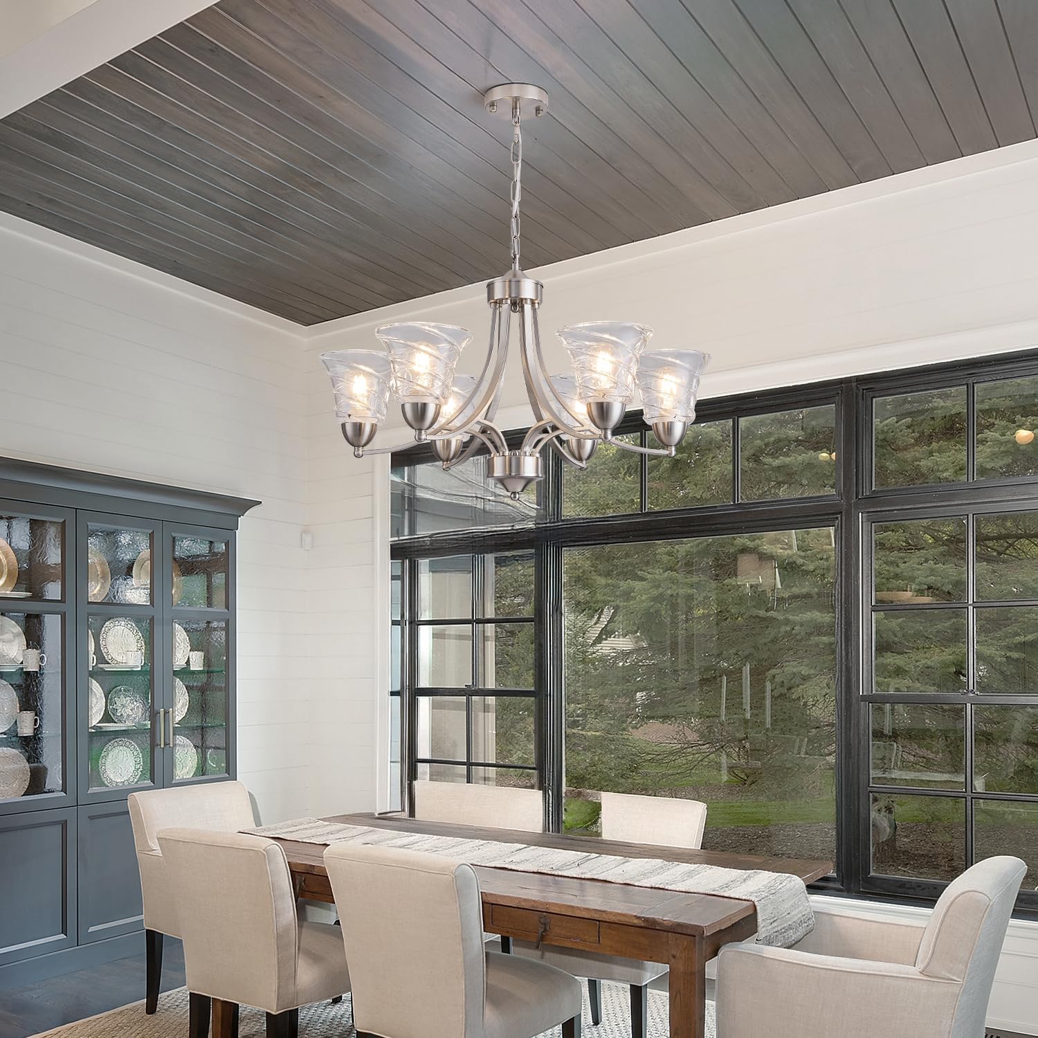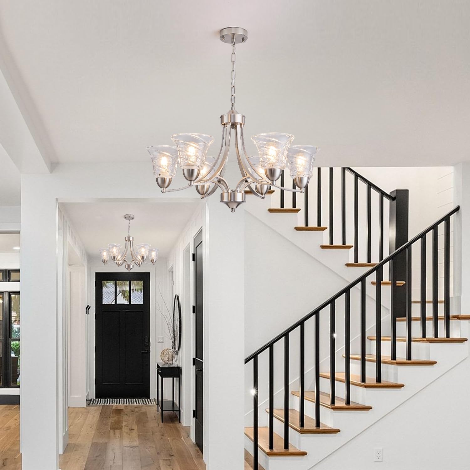 Modern Brushed Nickel Farmhouse Chandelier 6 Light Silver Chandeliers for Dining Room Adjustable Height Hanging Light Fixture with Clear Glass Shade,Pendant Light Fixture for Living Room Hallway Foyer