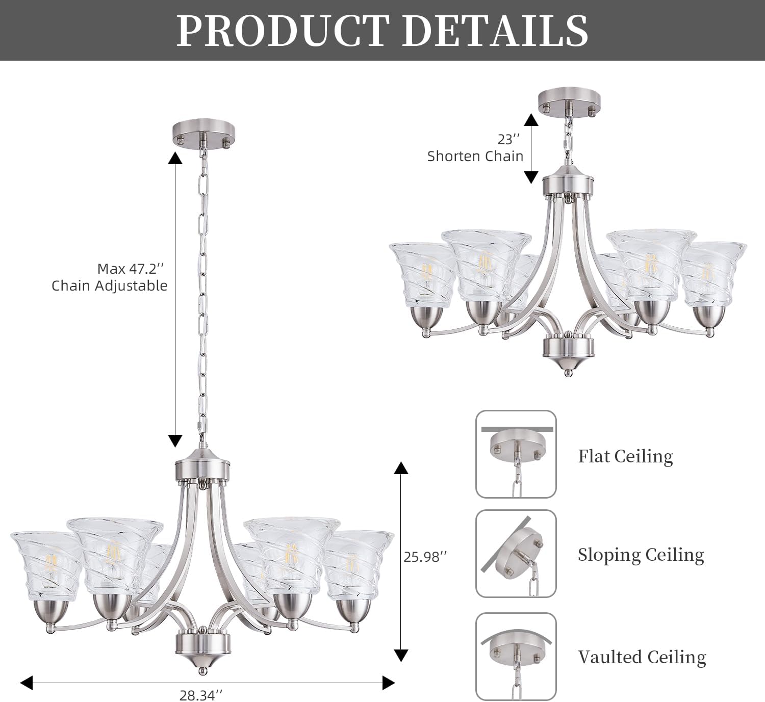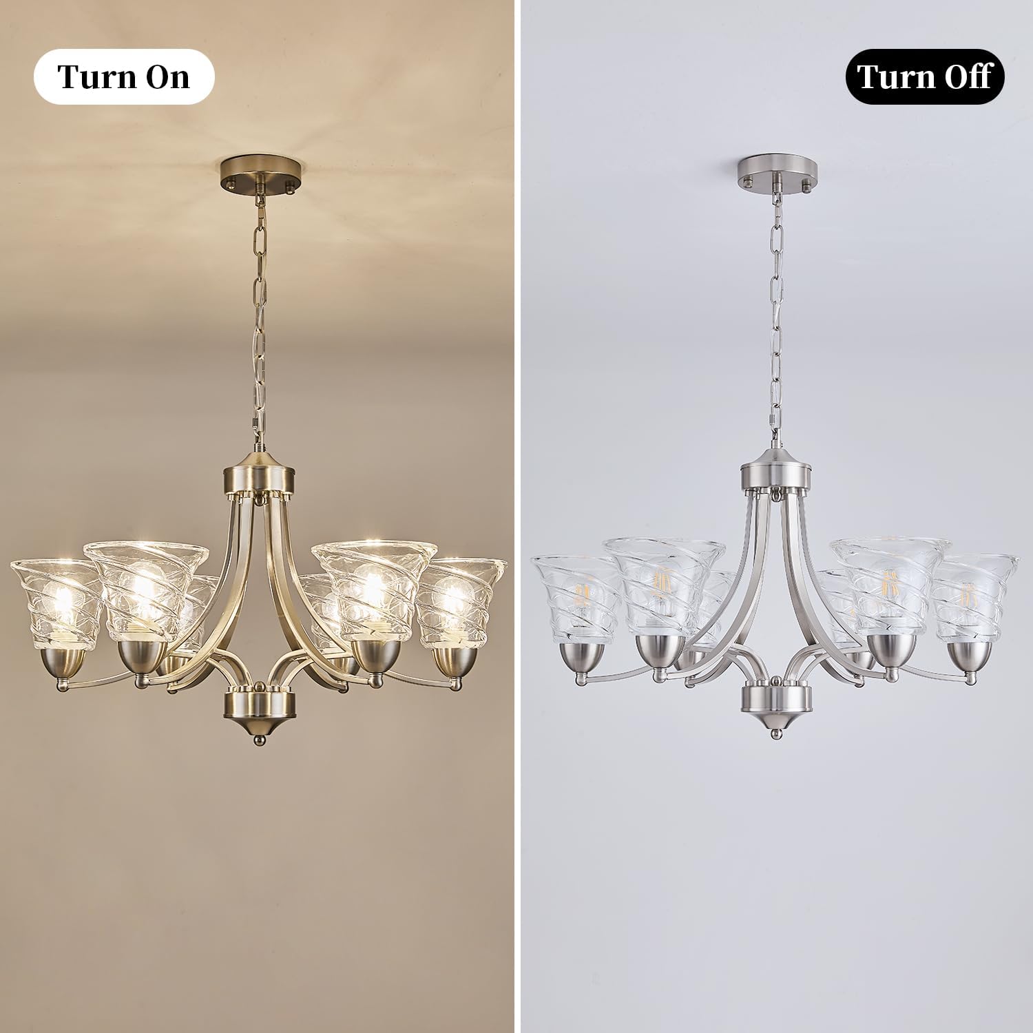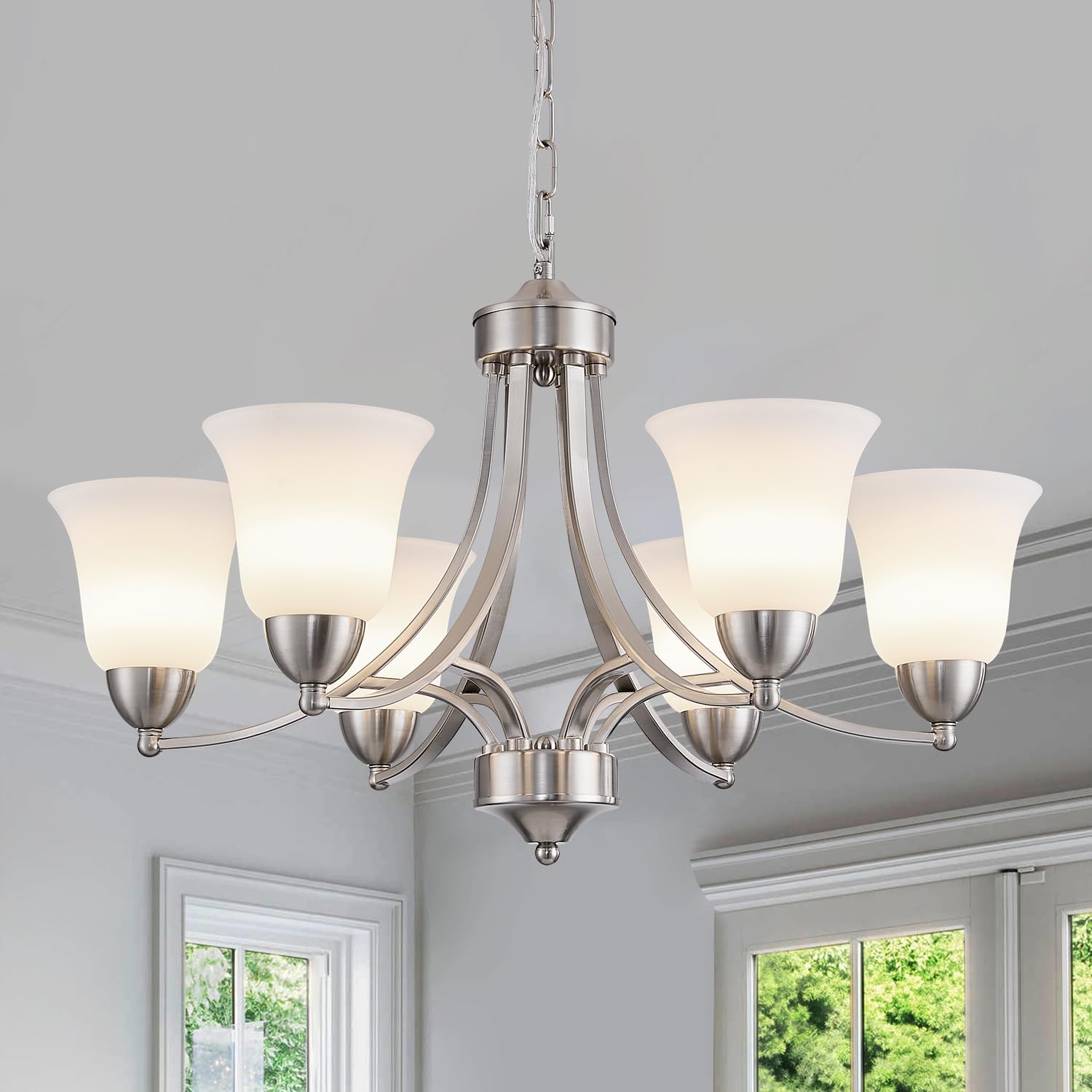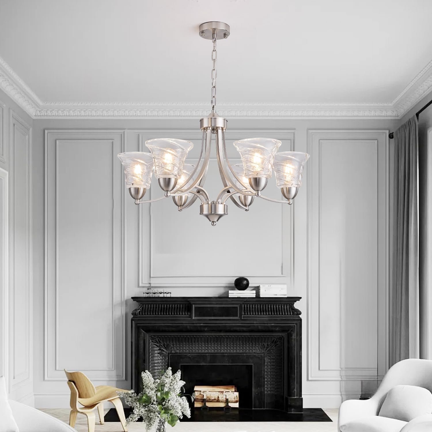 Modern Brushed Nickel Farmhouse Chandelier 6 Light Silver Chandeliers for Dining Room Adjustable Height Hanging Light Fixture with Clear Glass Shade,Pendant Light Fixture for Living Room Hallway Foyer