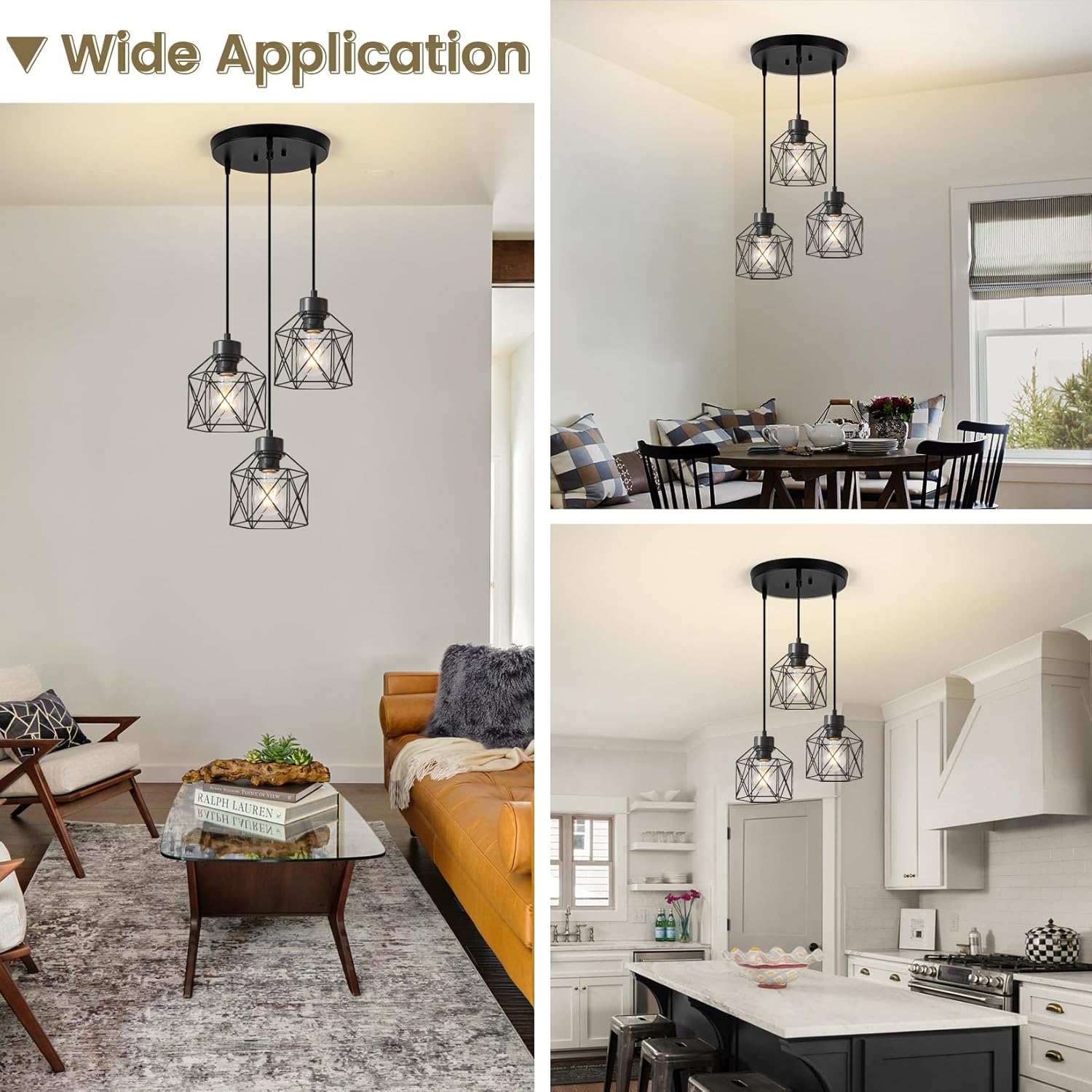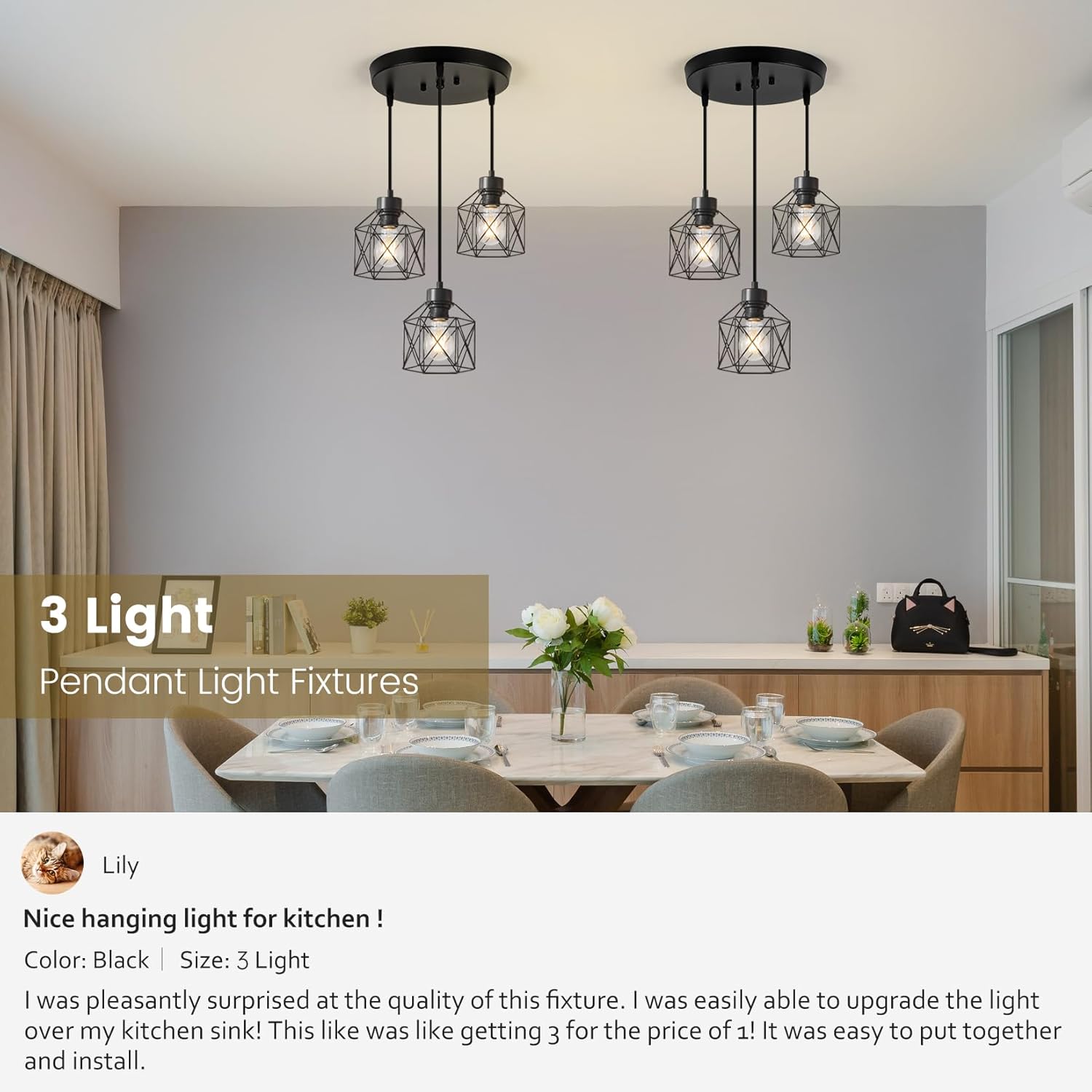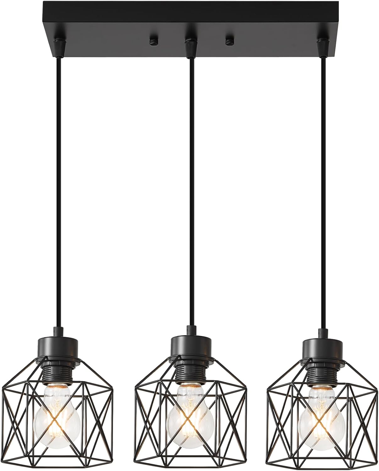 ROCUNSI 3-Light Pendant Light Fixtures, Farmhouse Hanging Pendant Lighting, Dining Room Chandelier, Industrial Kitchen Island Hanging Light Fixture, Black Metal Cage Pendant Ceiling Lamp for Kitchen