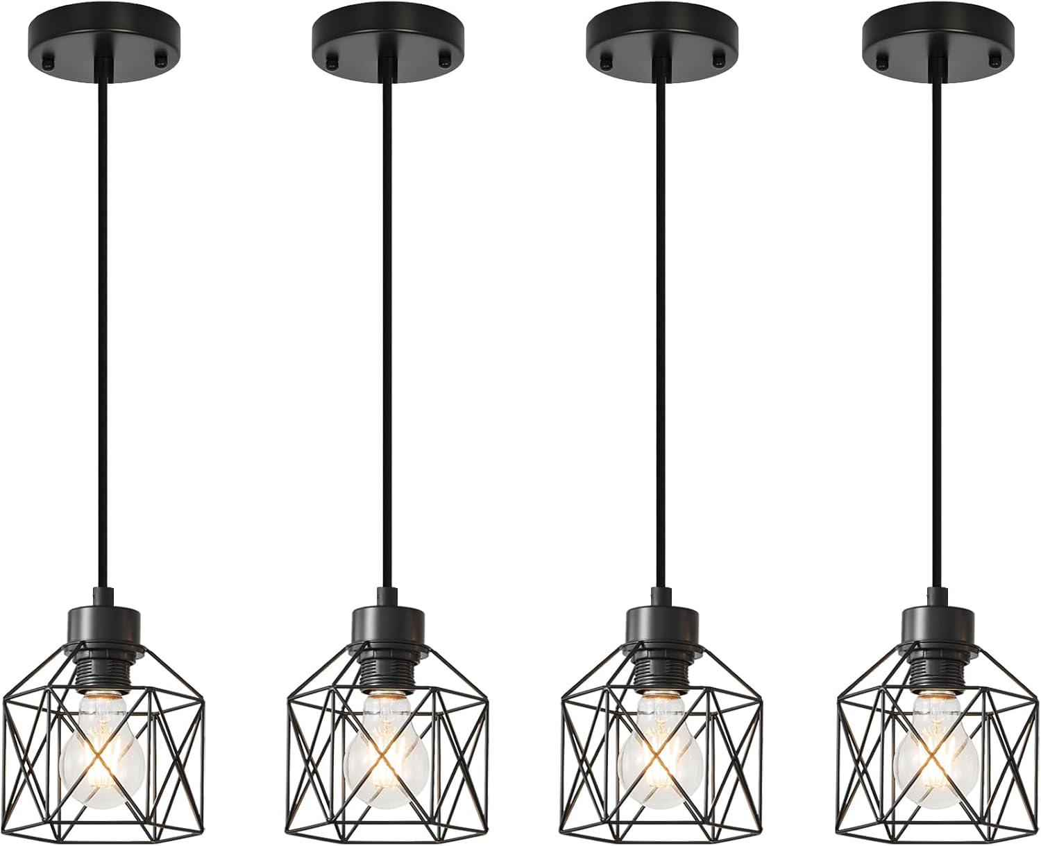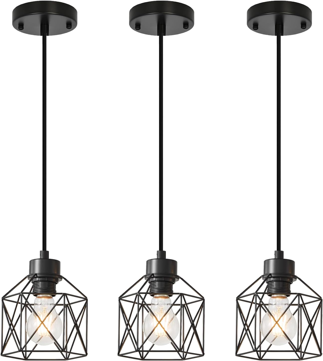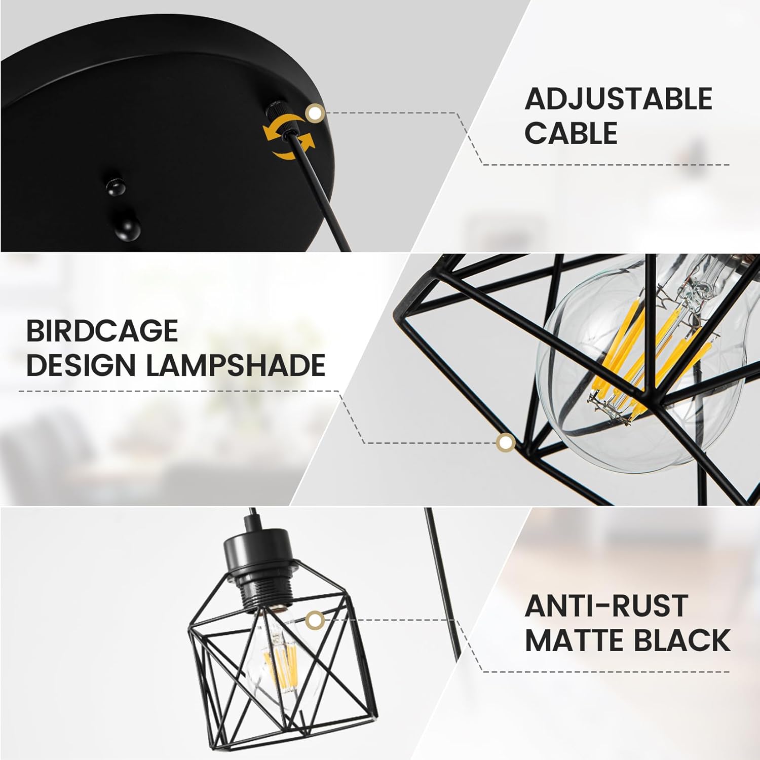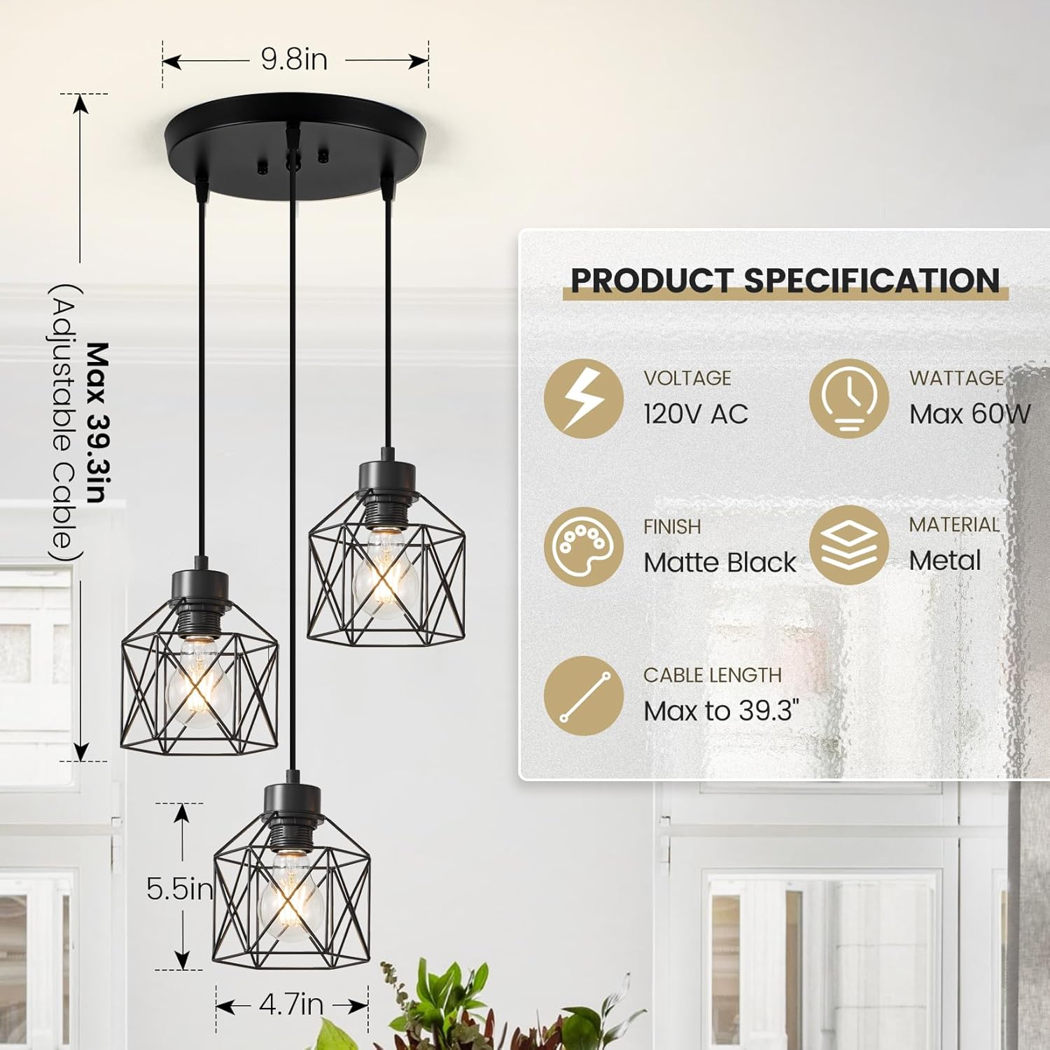 ROCUNSI 3-Light Pendant Light Fixtures, Farmhouse Hanging Pendant Lighting, Dining Room Chandelier, Industrial Kitchen Island Hanging Light Fixture, Black Metal Cage Pendant Ceiling Lamp for Kitchen