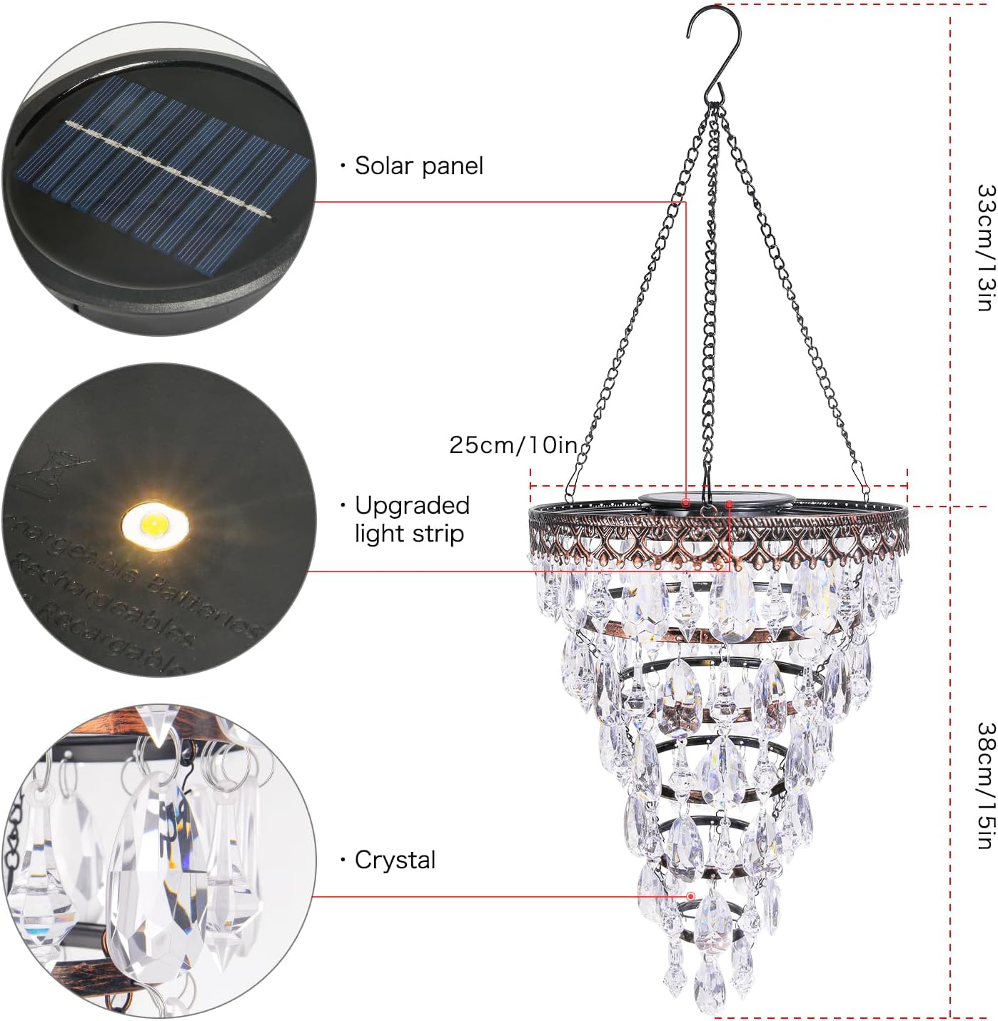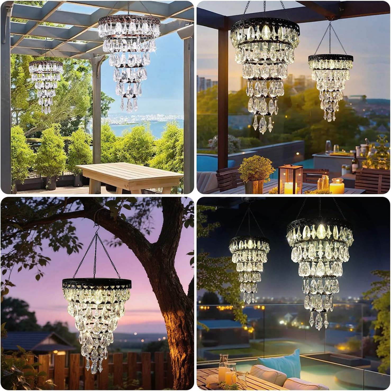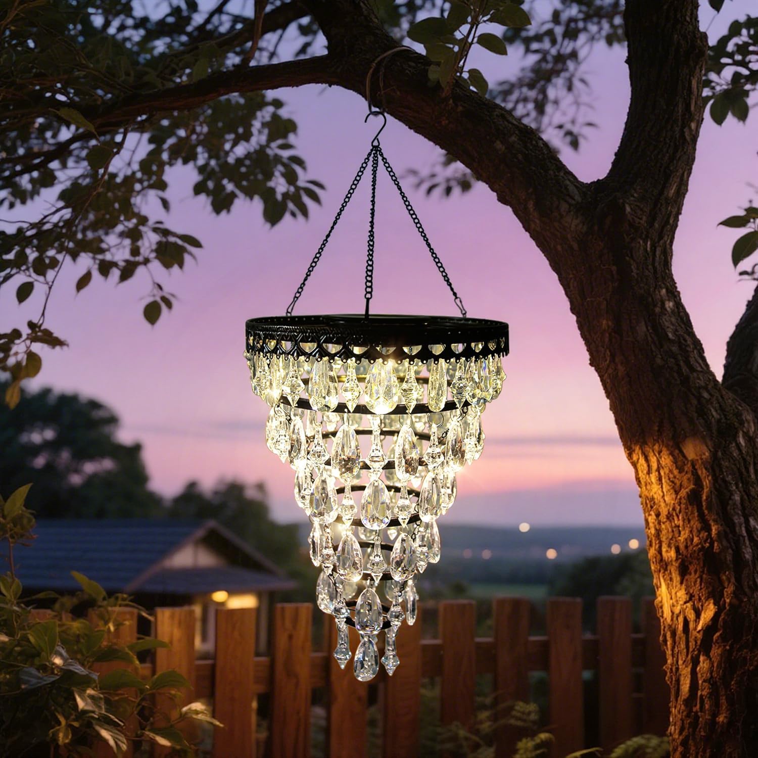 Solar Hanging Acrylic Crystal Chandelier Outdoor Garden Decorative Lights a Bright Warm LED and 5ft LED Strip Weatherproof Tree Hanging Lantern for Valentine Gifts Garden Gazebo, Party, Wedding 6 Tier
