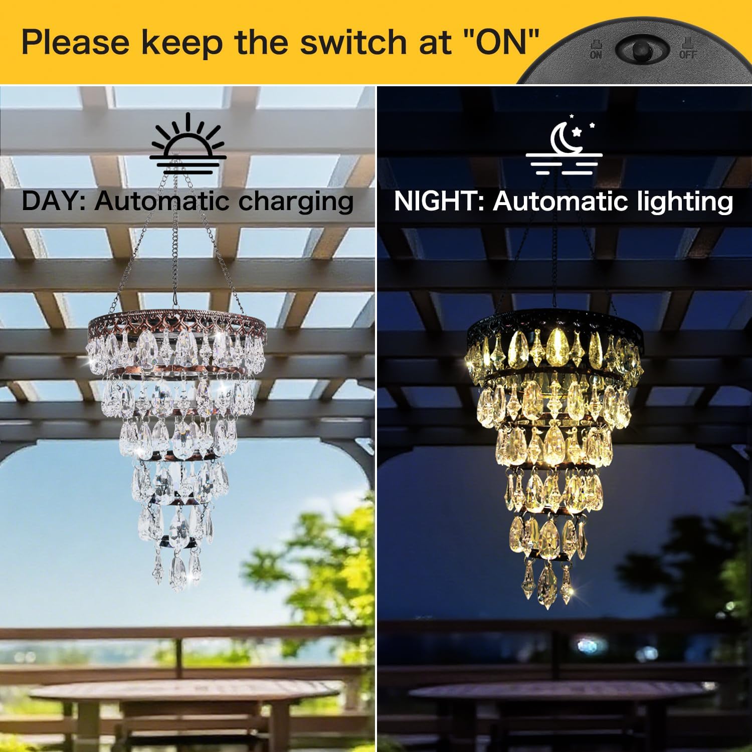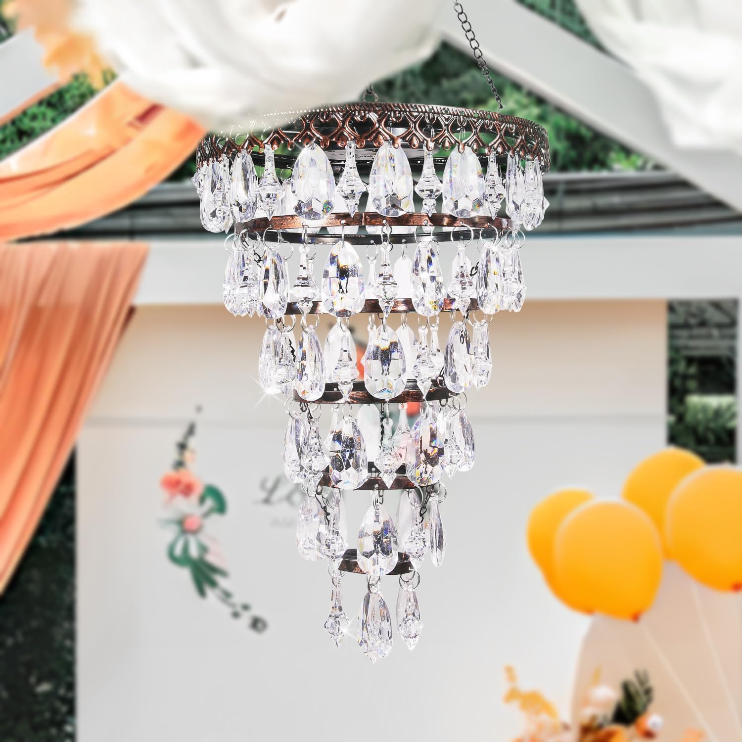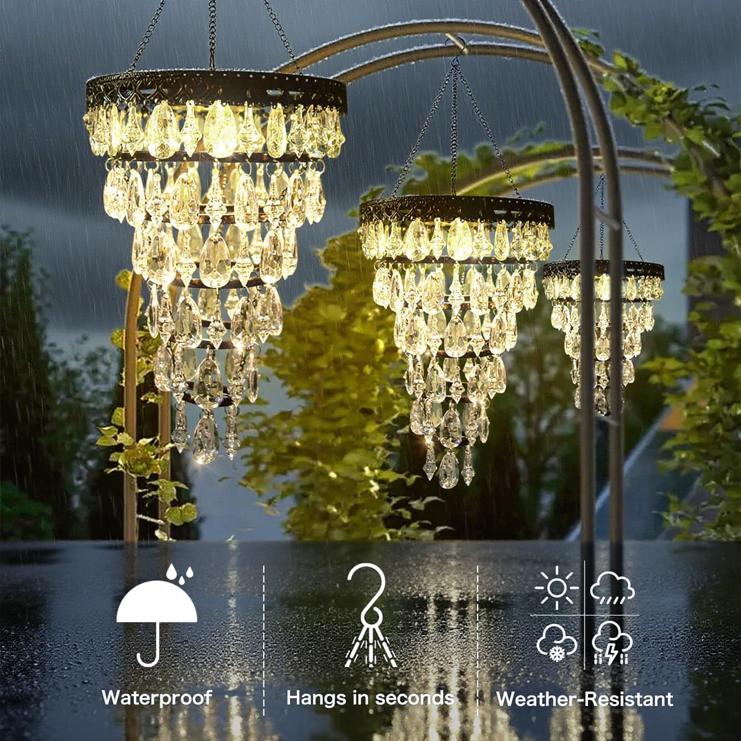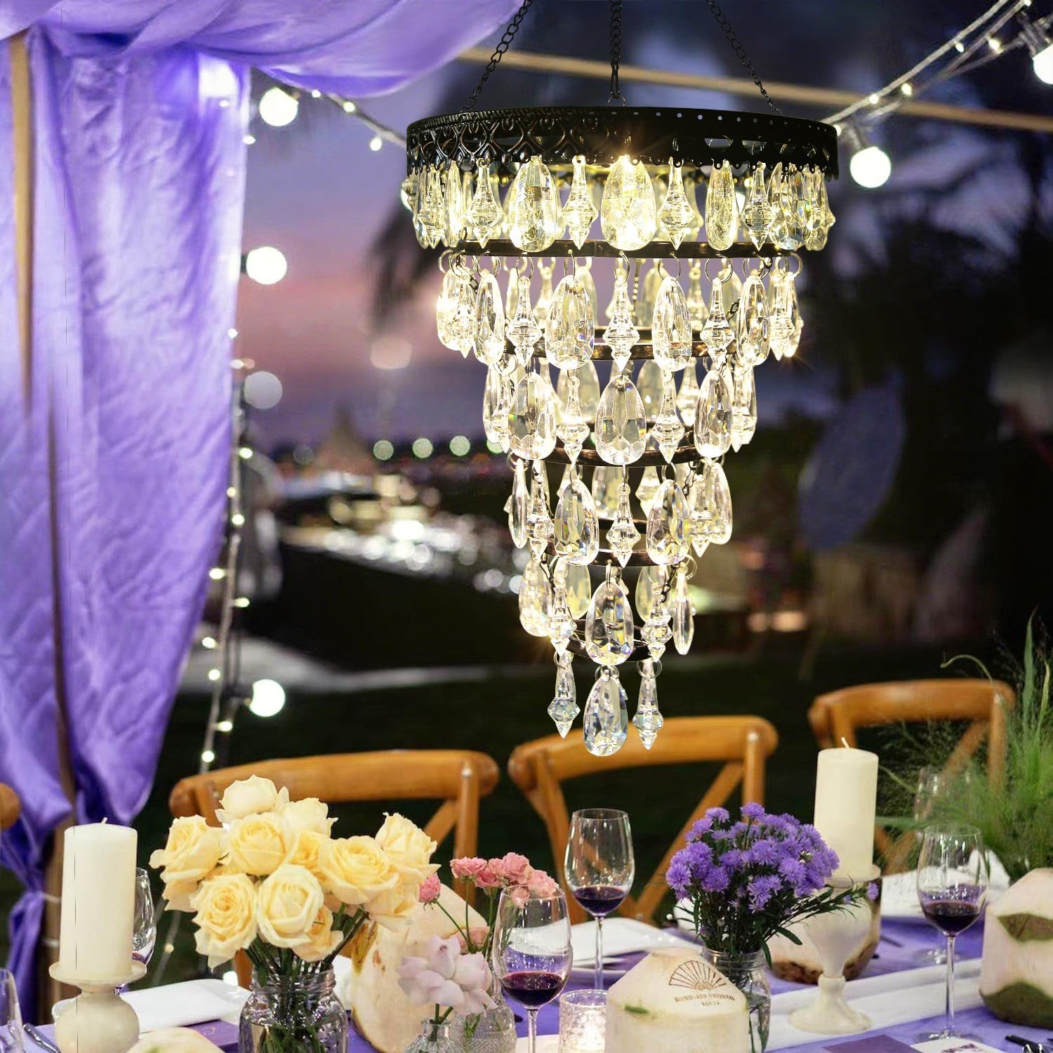 Solar Hanging Acrylic Crystal Chandelier Outdoor Garden Decorative Lights a Bright Warm LED and 5ft LED Strip Weatherproof Tree Hanging Lantern for Valentine Gifts Garden Gazebo, Party, Wedding 6 Tier
