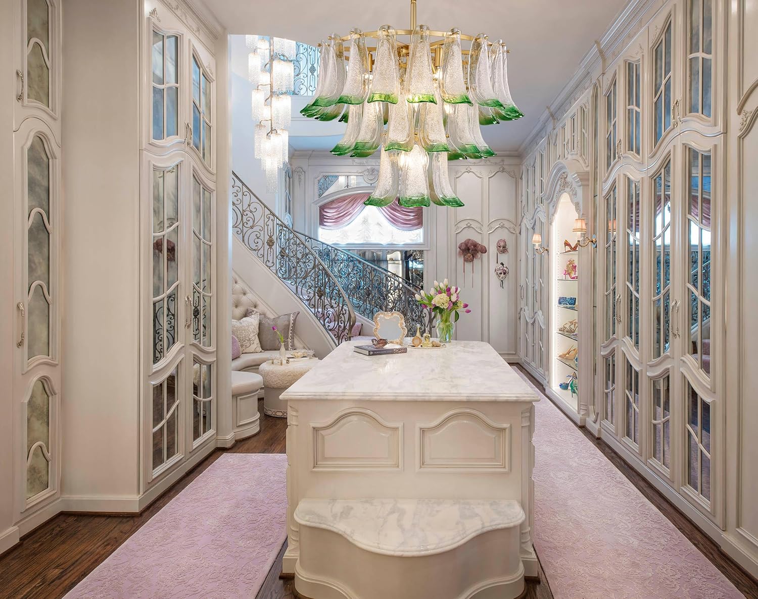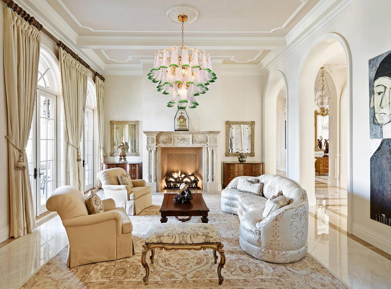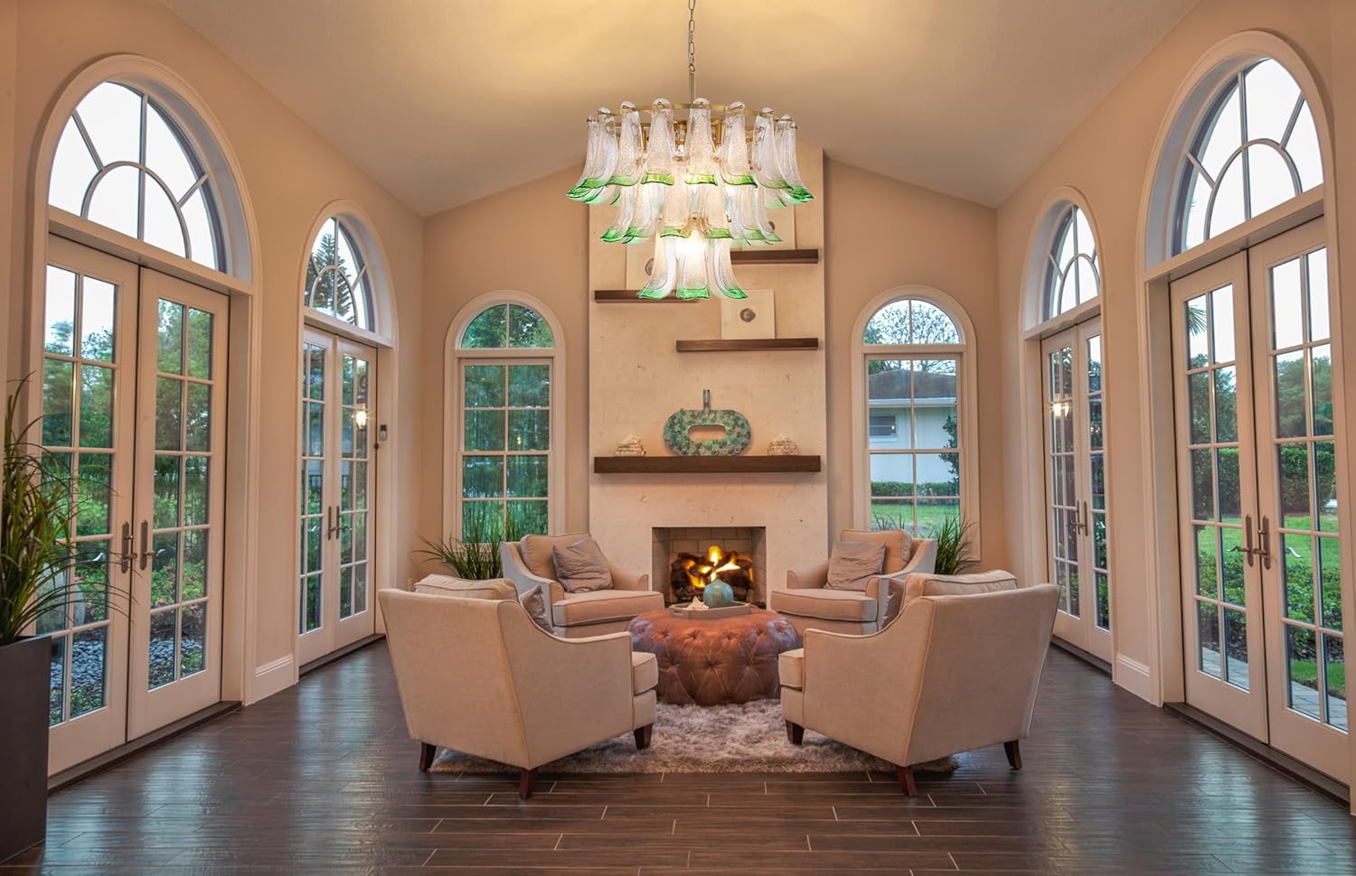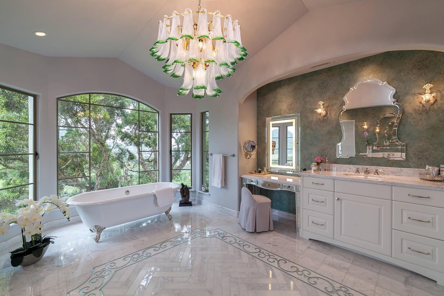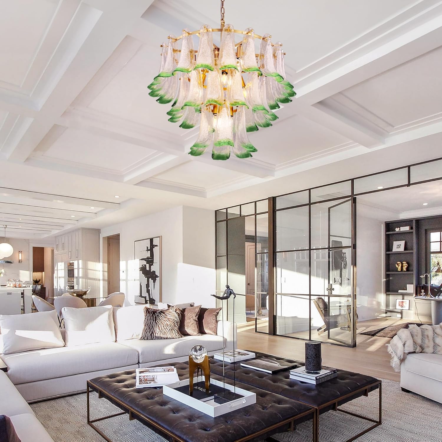 TOCHIC Mid Century Modern Chandelier Light Fixture, Gold Tiered Green Glass Chandelier for High Ceiling, Large Floral Pendant Ceiling Lighting for Living Room, Hall, Foyer, 30in W