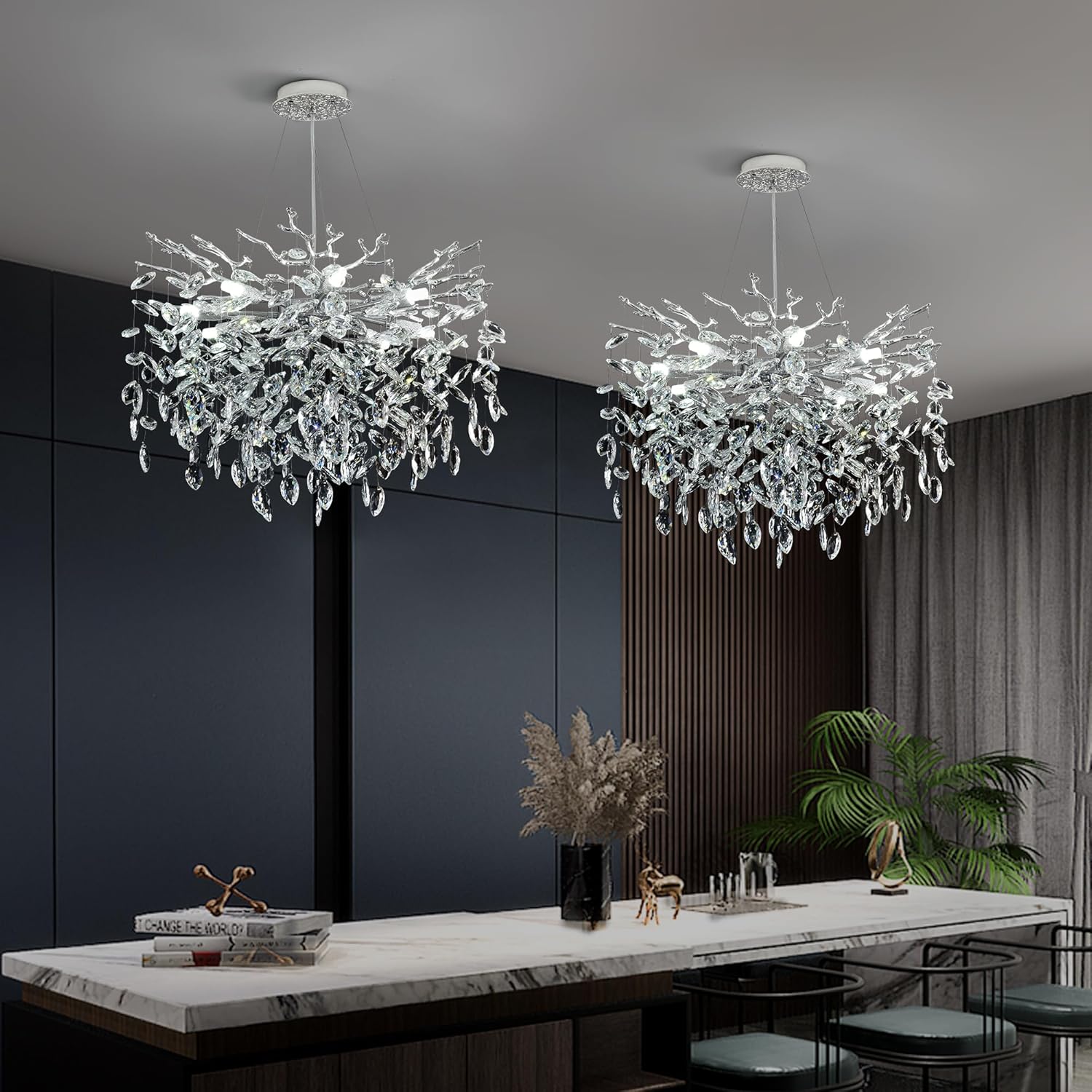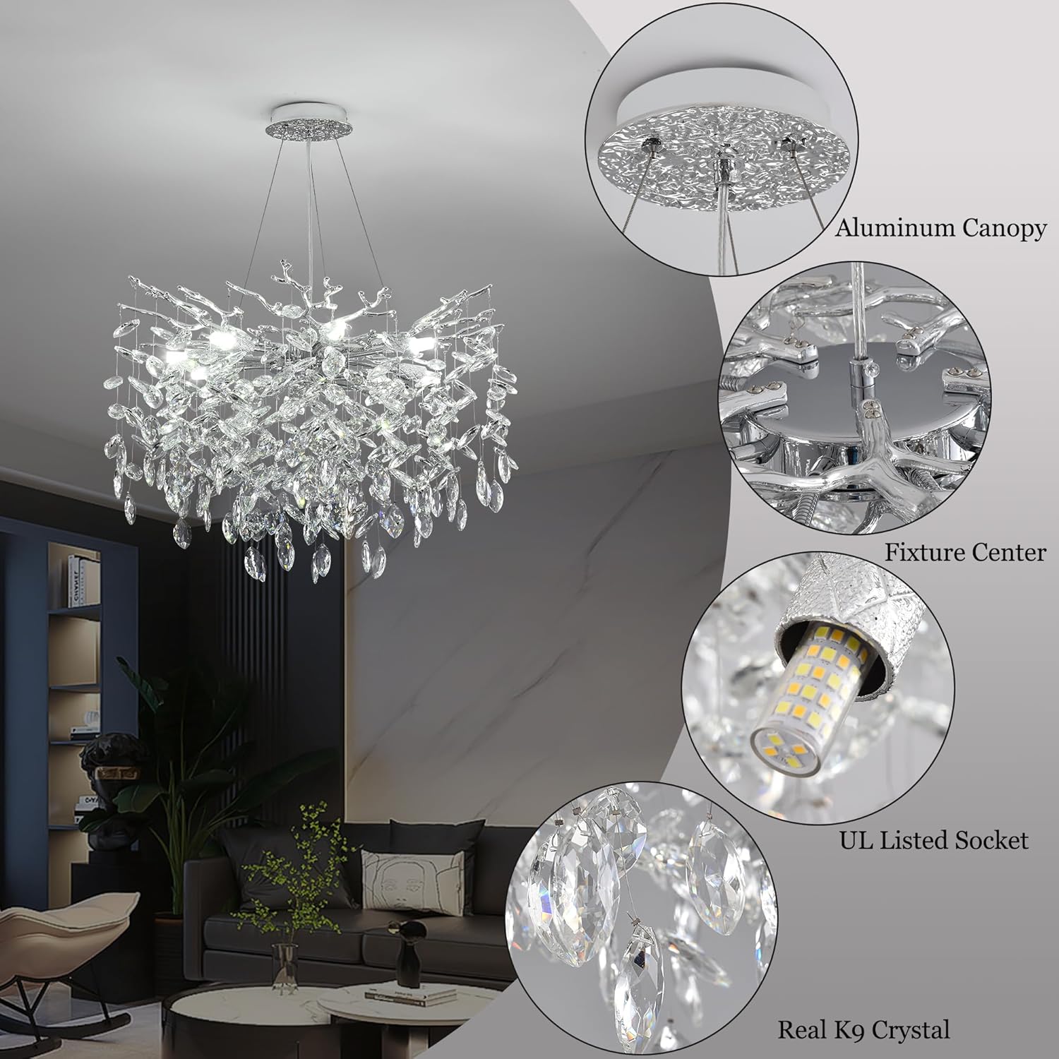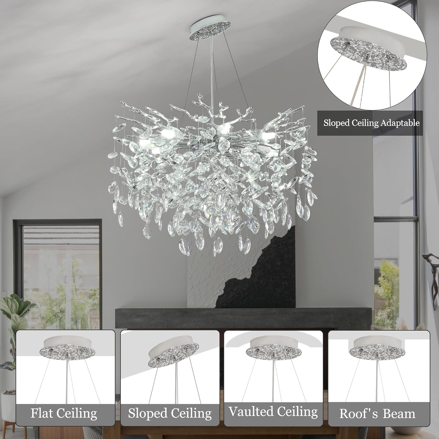 Upfelw Modern Crystal Tree Branch Chandelier, D18” Luxury Chrome Round Art Deco Raindrop Pendant Lighting Fixture for Dining Room Living Room Bedroom Foyer 6 Lights