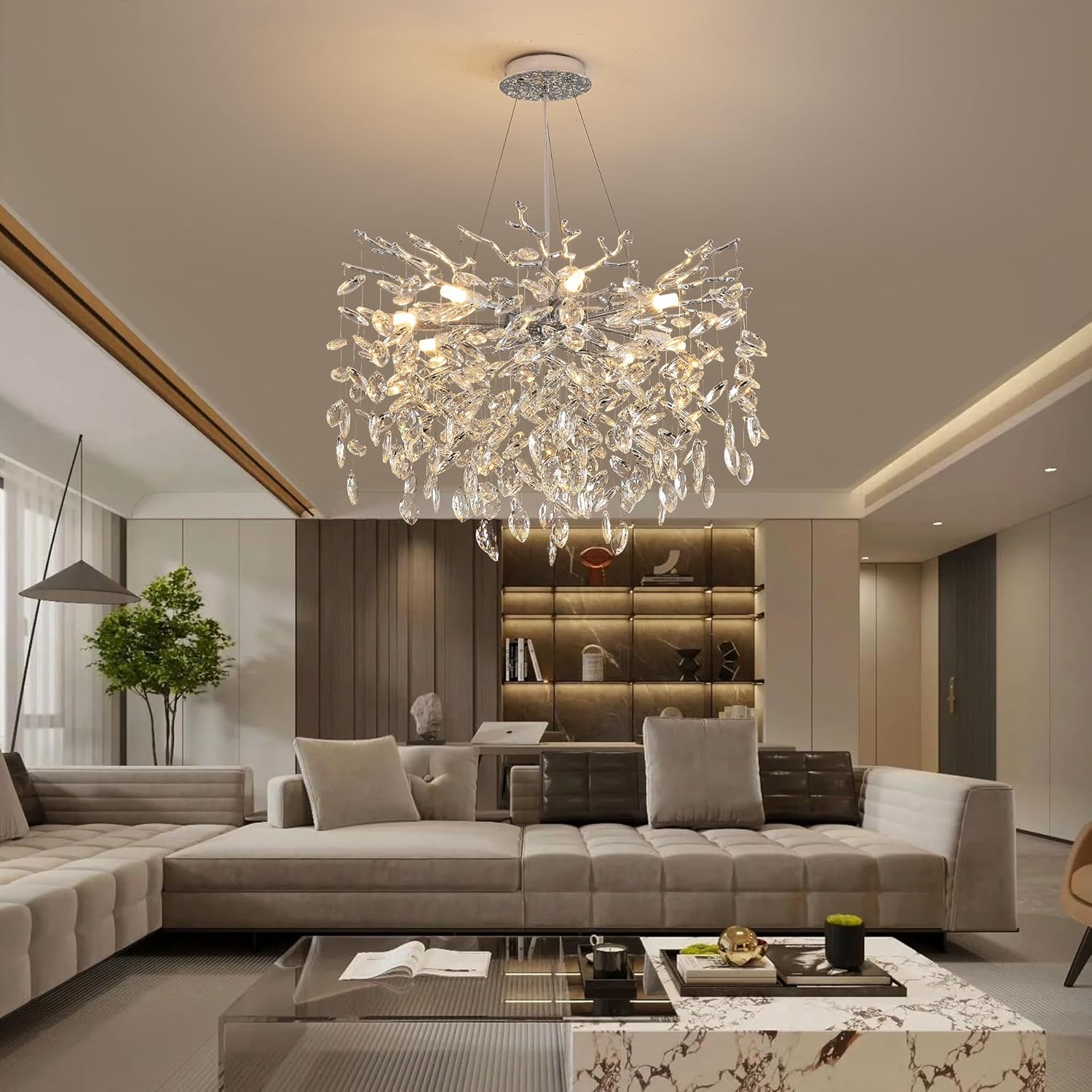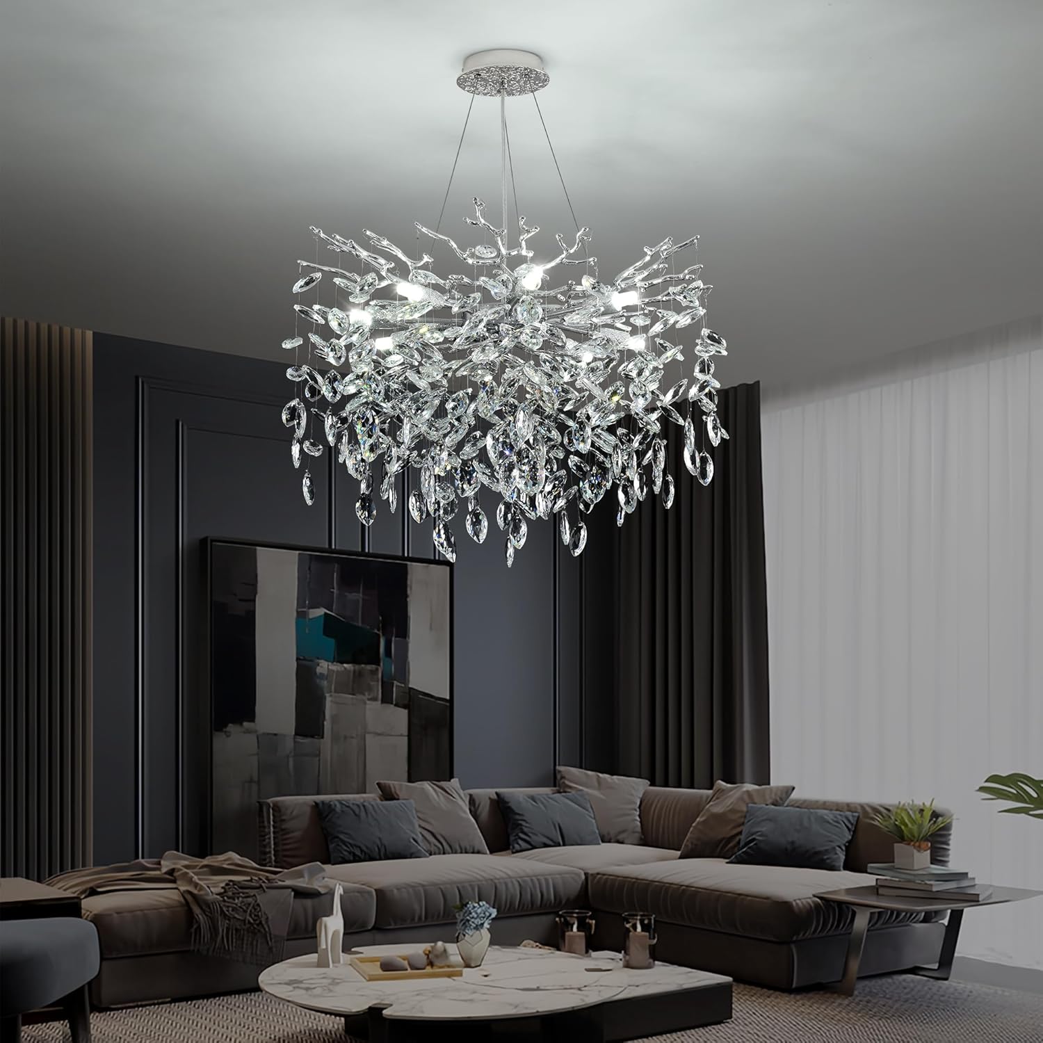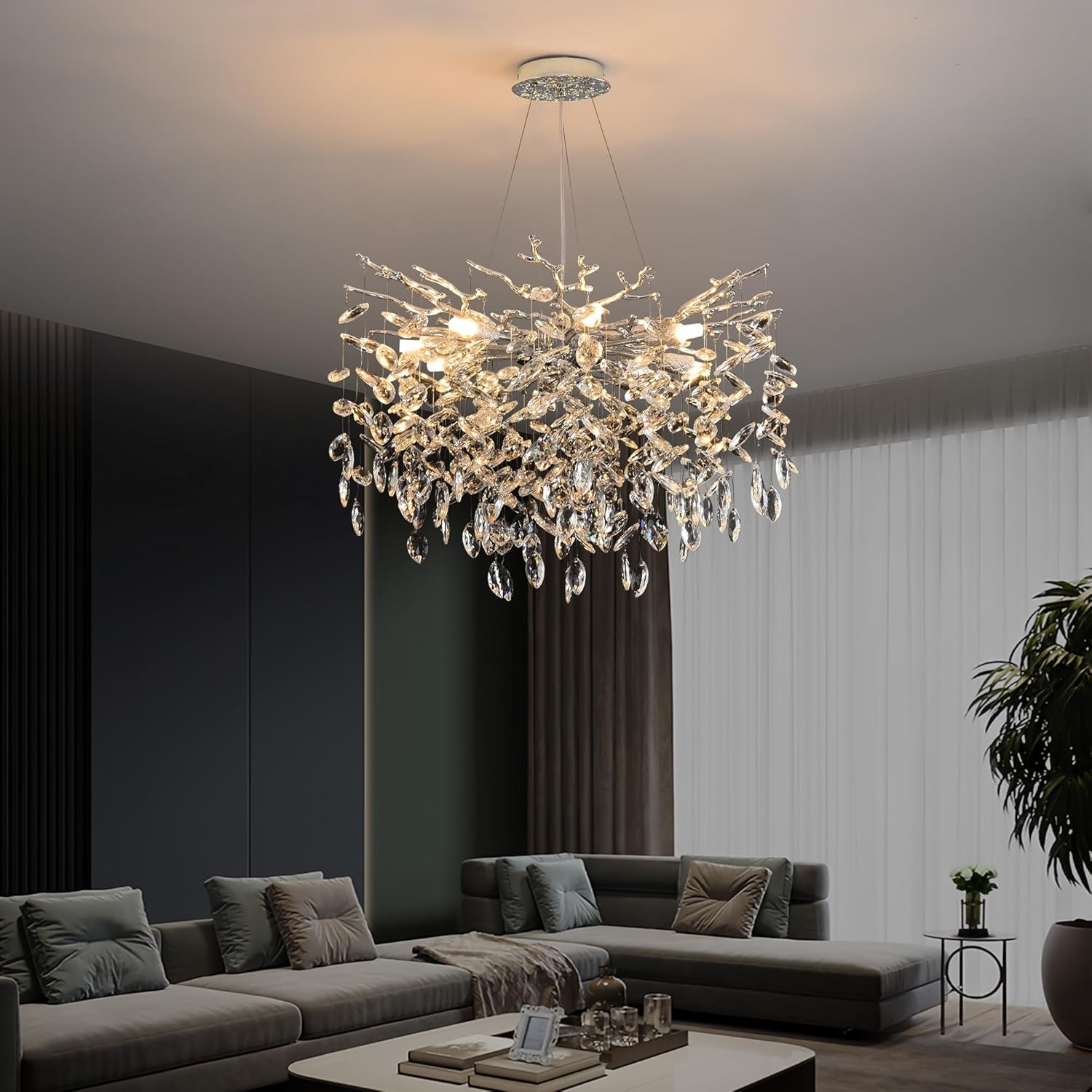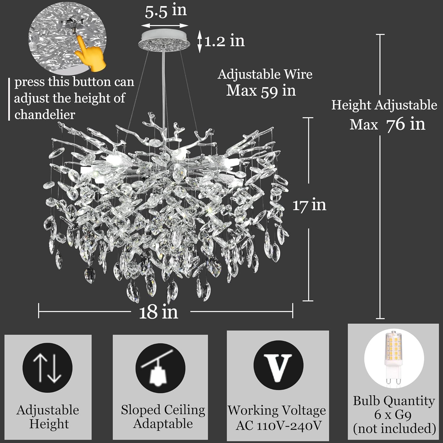 Upfelw Modern Crystal Tree Branch Chandelier, D18” Luxury Chrome Round Art Deco Raindrop Pendant Lighting Fixture for Dining Room Living Room Bedroom Foyer 6 Lights