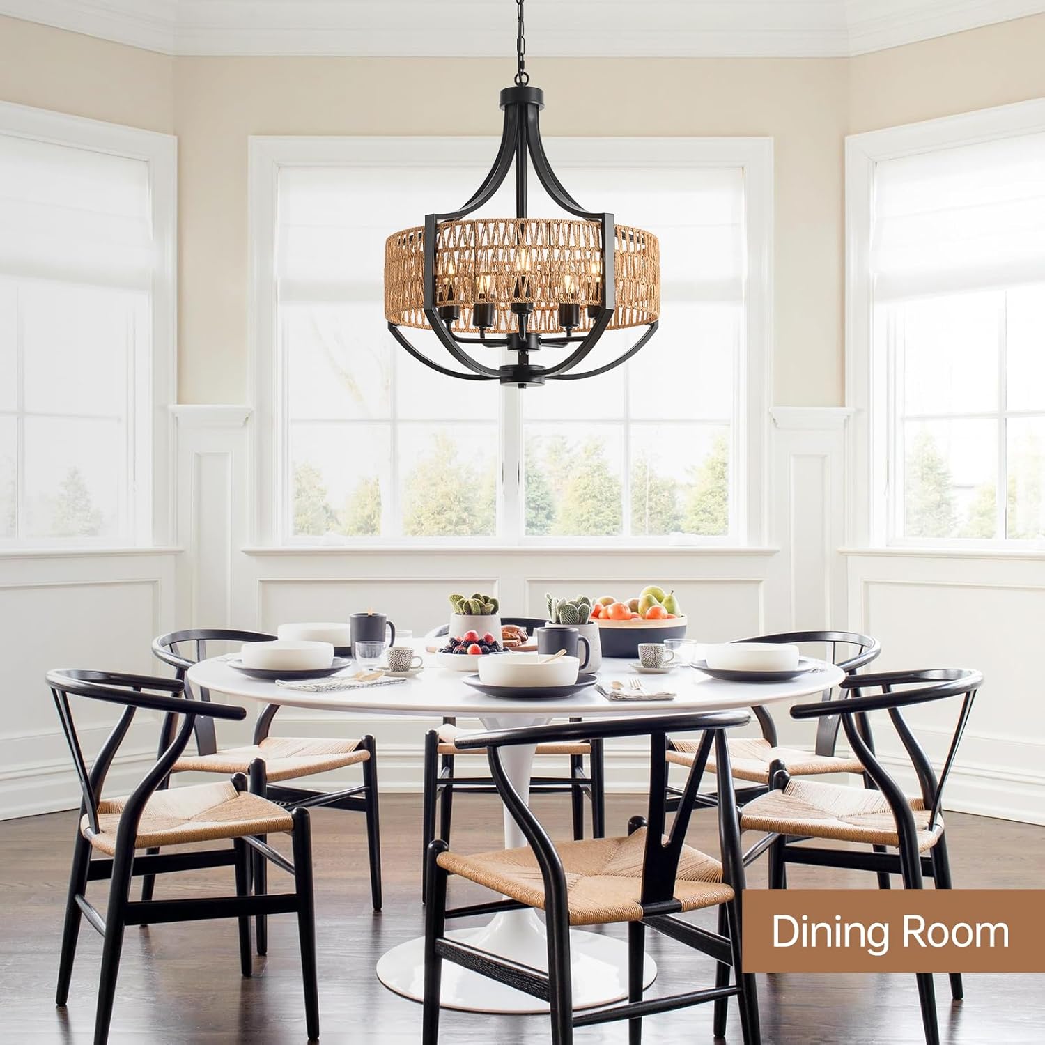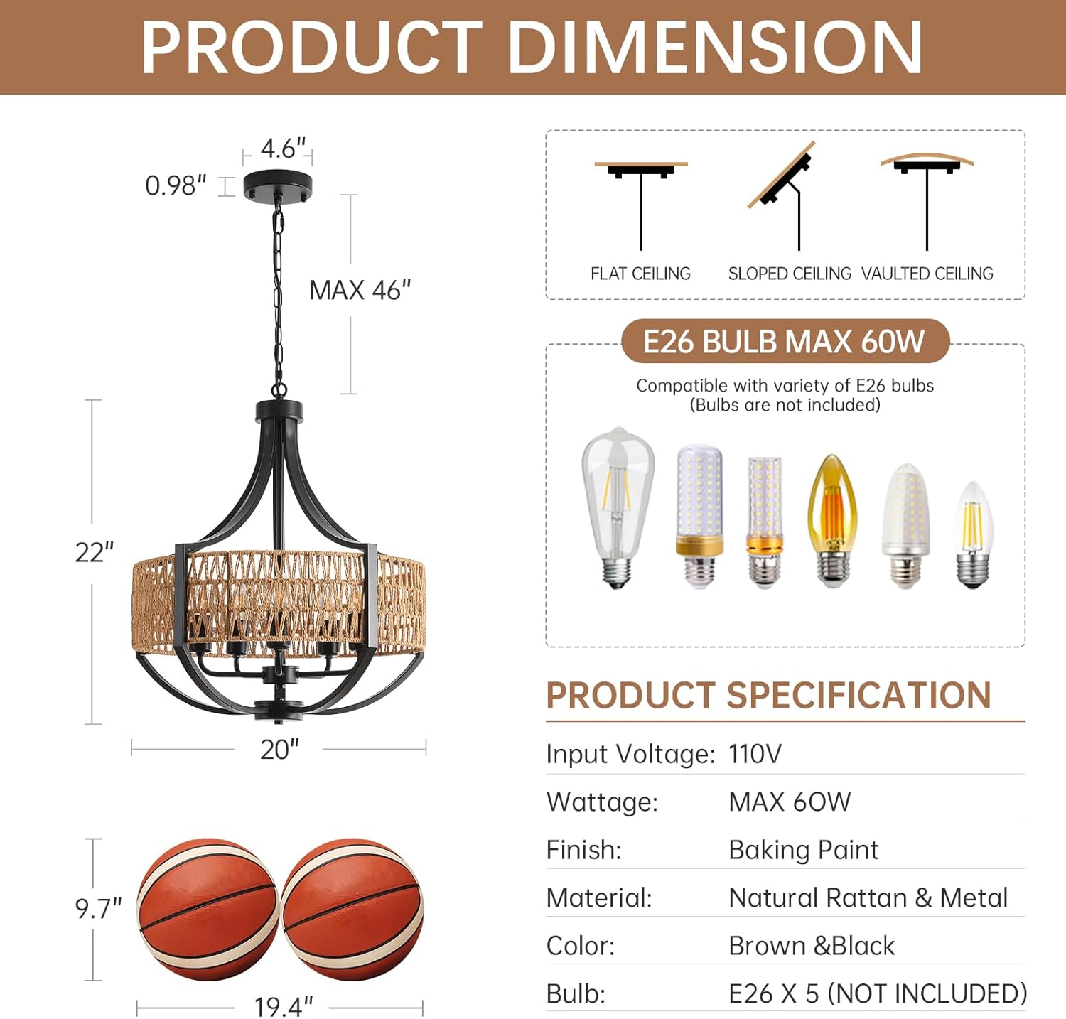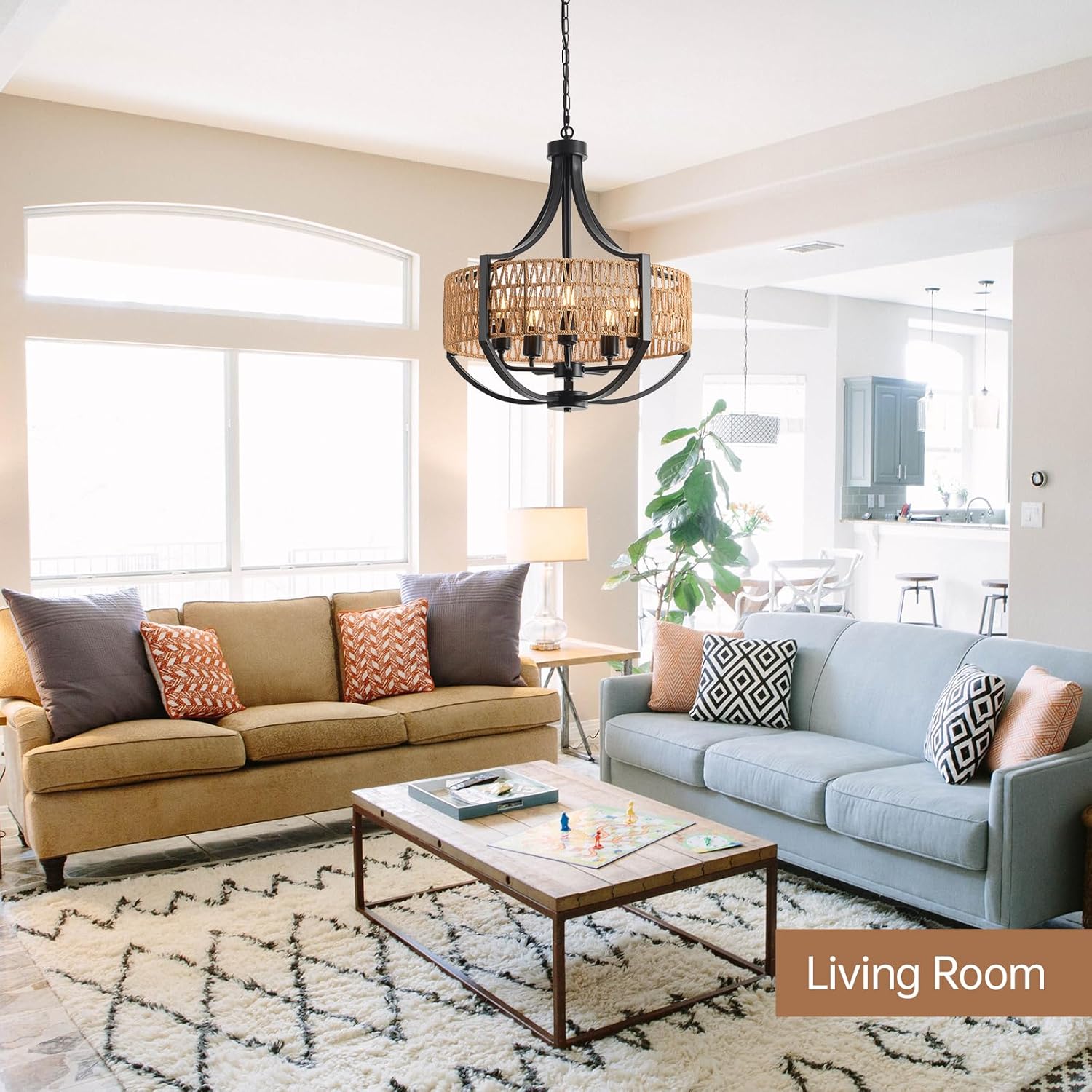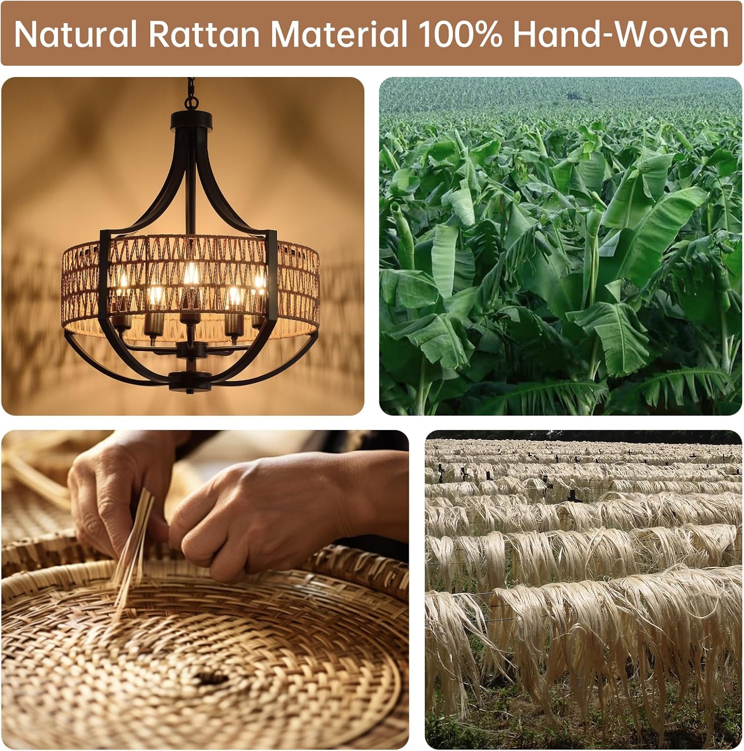 VDWO 20″ Rattan Farmhouse Chandelier Light Fixtures,5-Light Rustic Rattan Pendant Lighting with Woven Wicker Shade Boho Black Hanging Ceiling Light for Dining Room Living Room Kitchen Island Bedroom