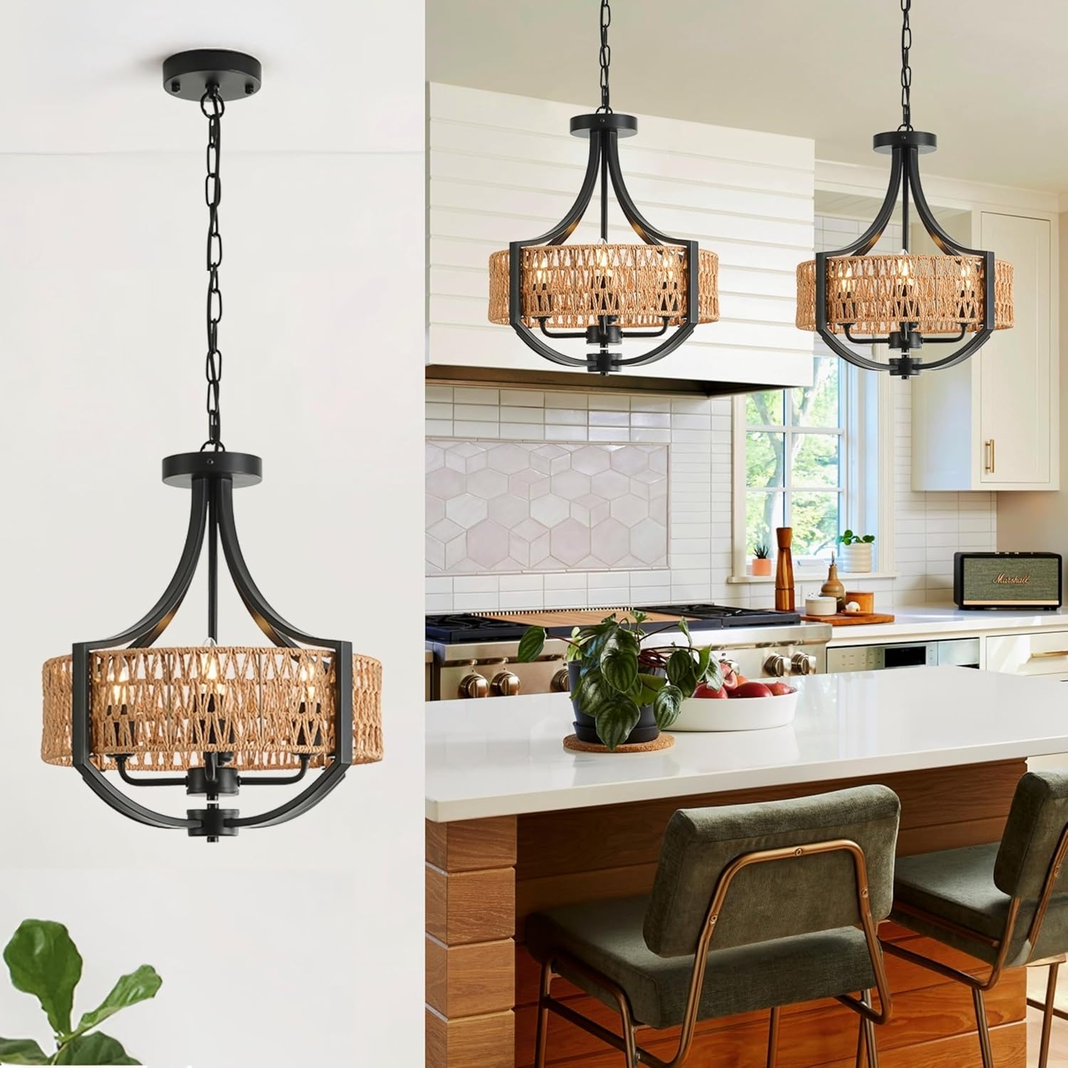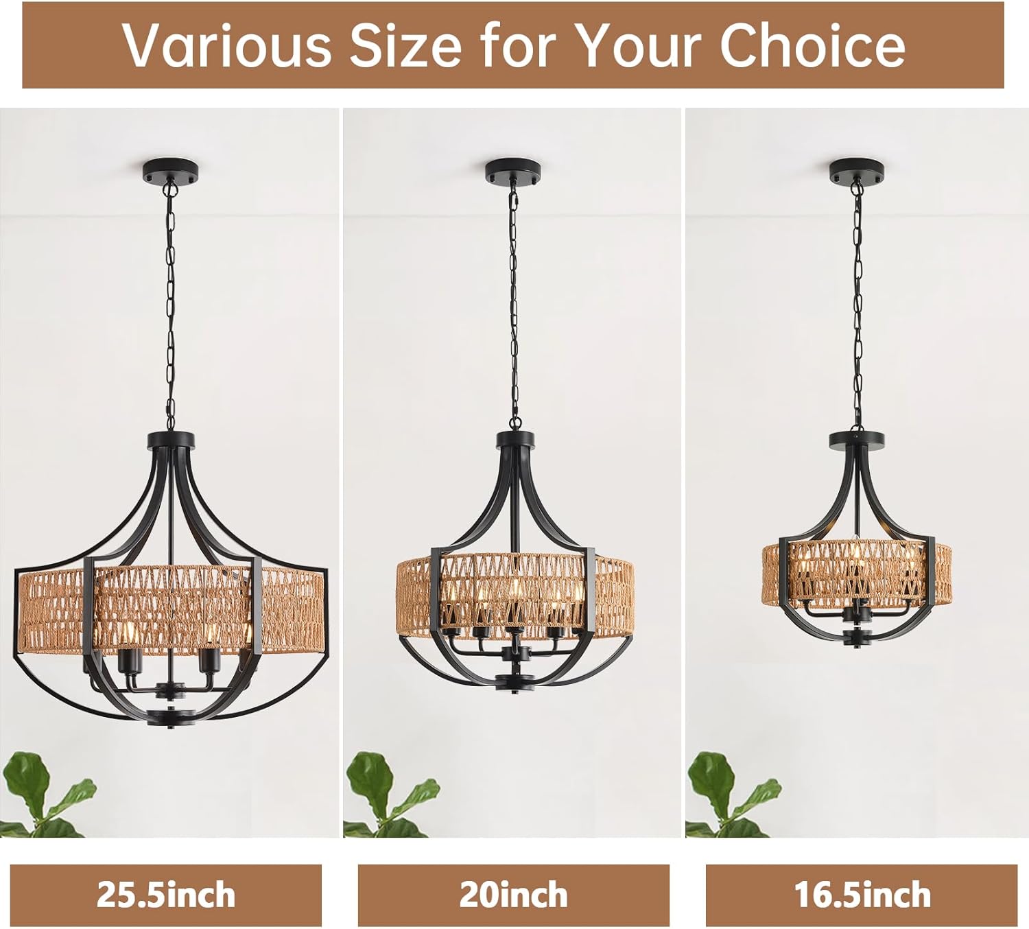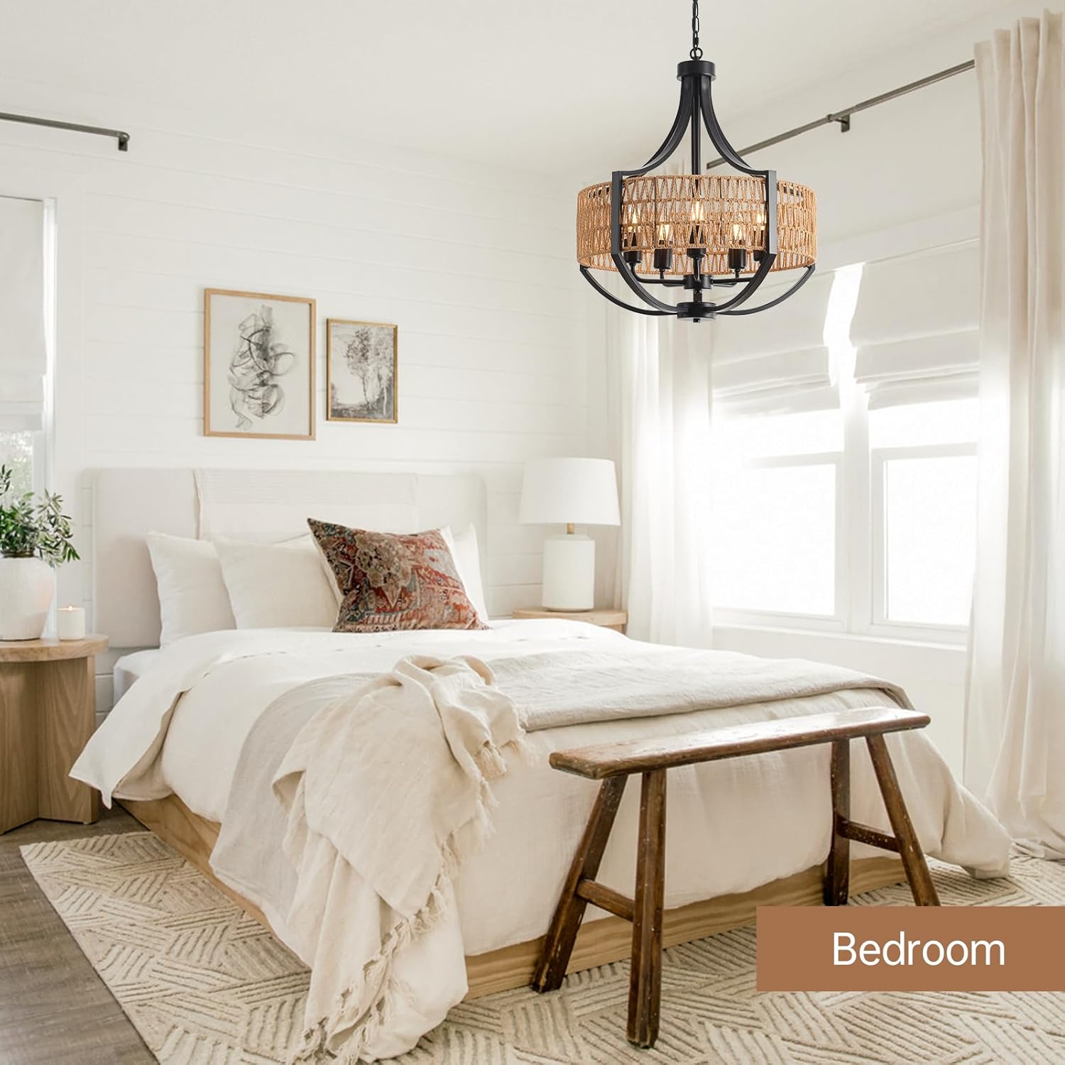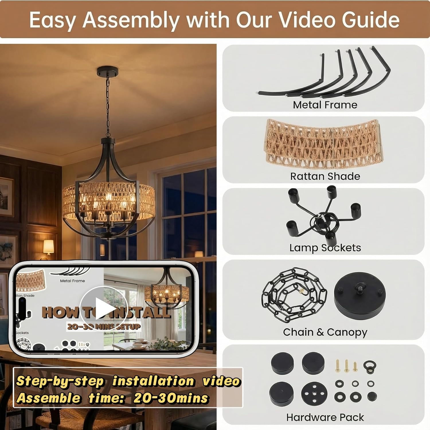 VDWO 20″ Rattan Farmhouse Chandelier Light Fixtures,5-Light Rustic Rattan Pendant Lighting with Woven Wicker Shade Boho Black Hanging Ceiling Light for Dining Room Living Room Kitchen Island Bedroom