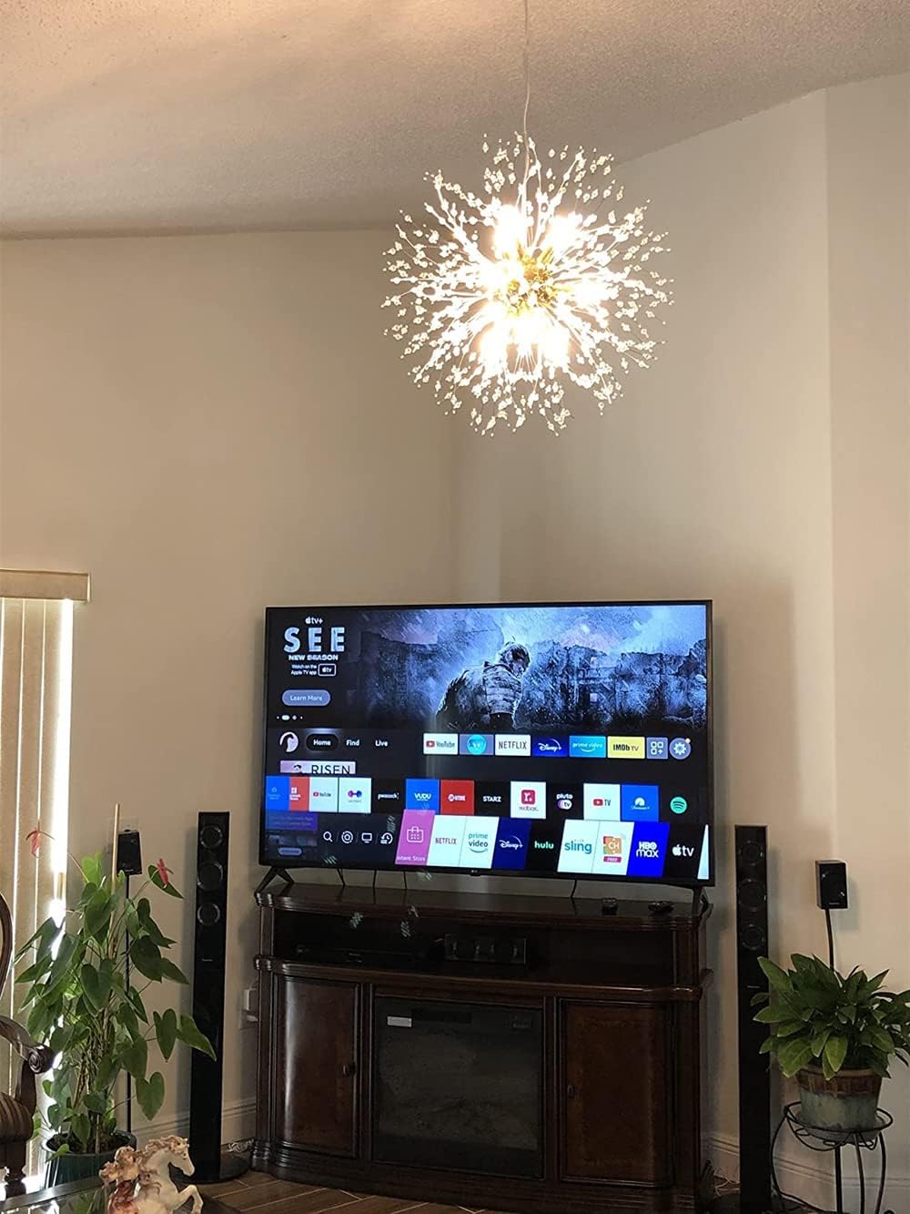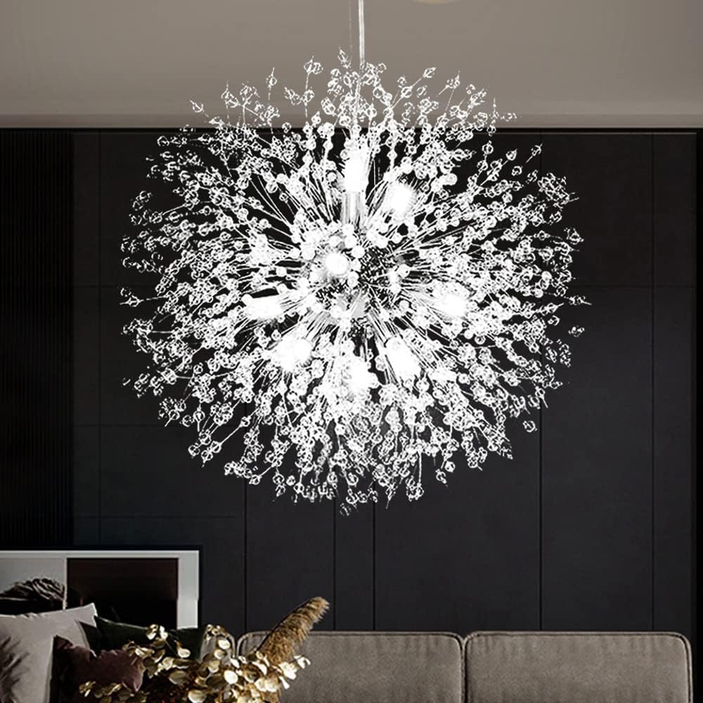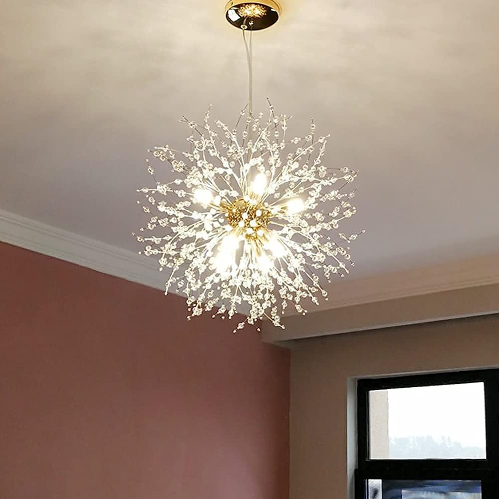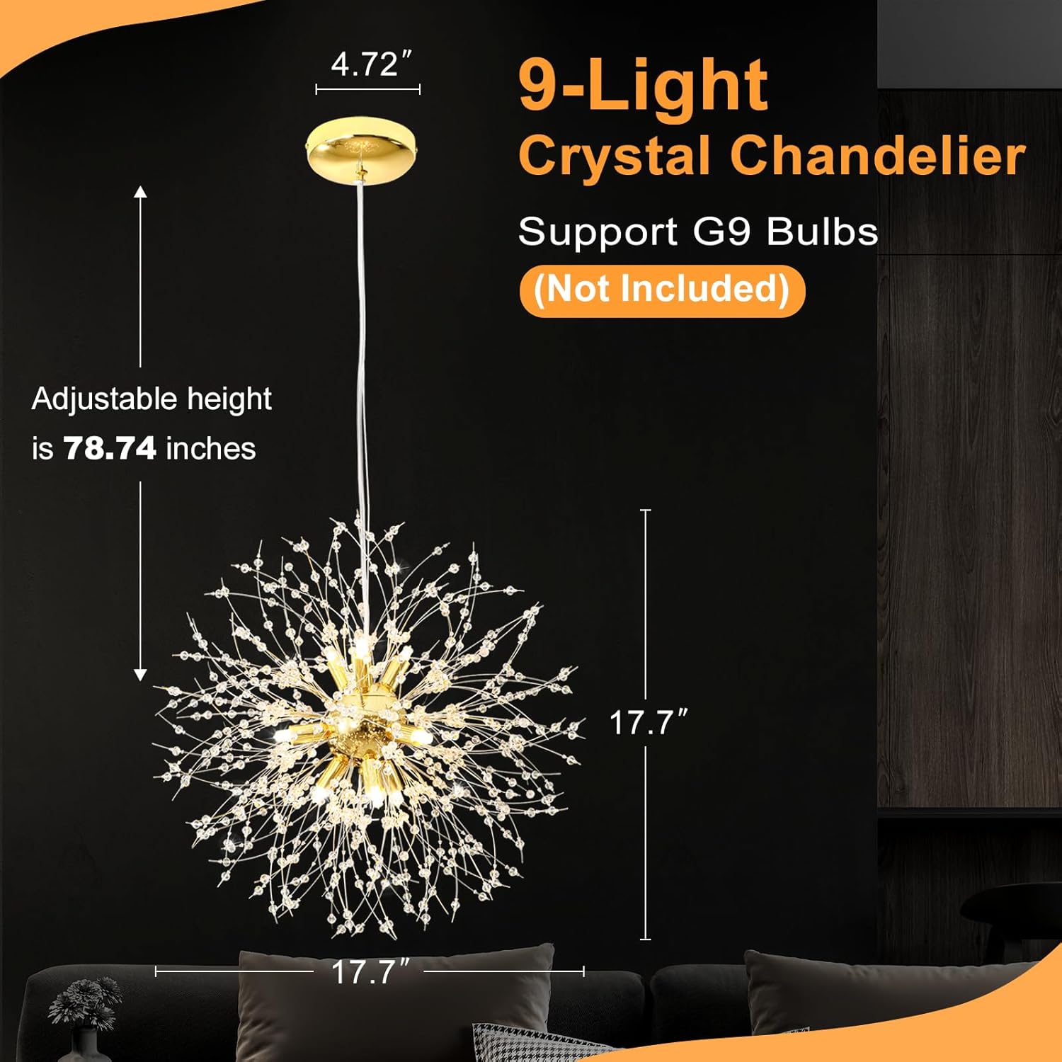 Yiisem Gold Crystal Chandeliers, 9-Light Modern Dandelion Firework Pendant Lighting, G9 Hanging Chandelier Light Fixtures for Dining Room Bedroom Hallway Kitchen Aisle