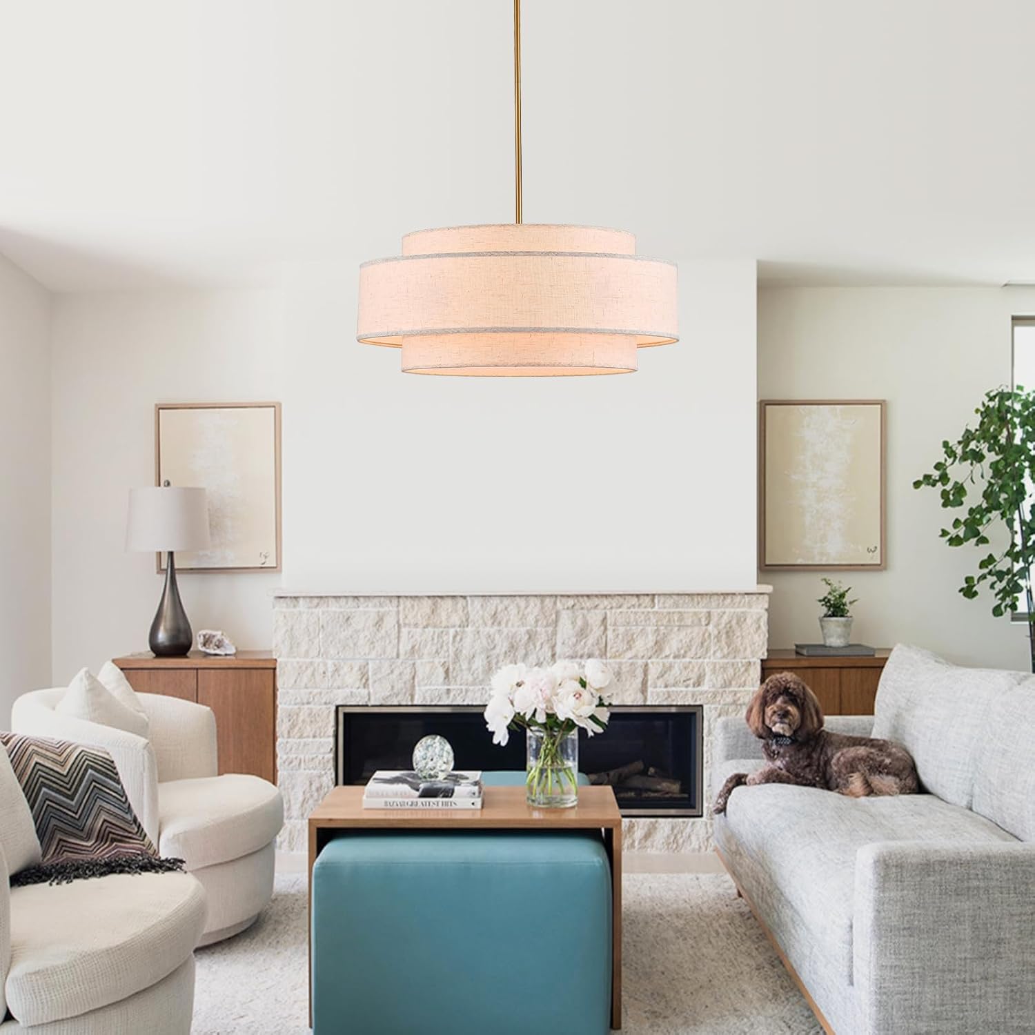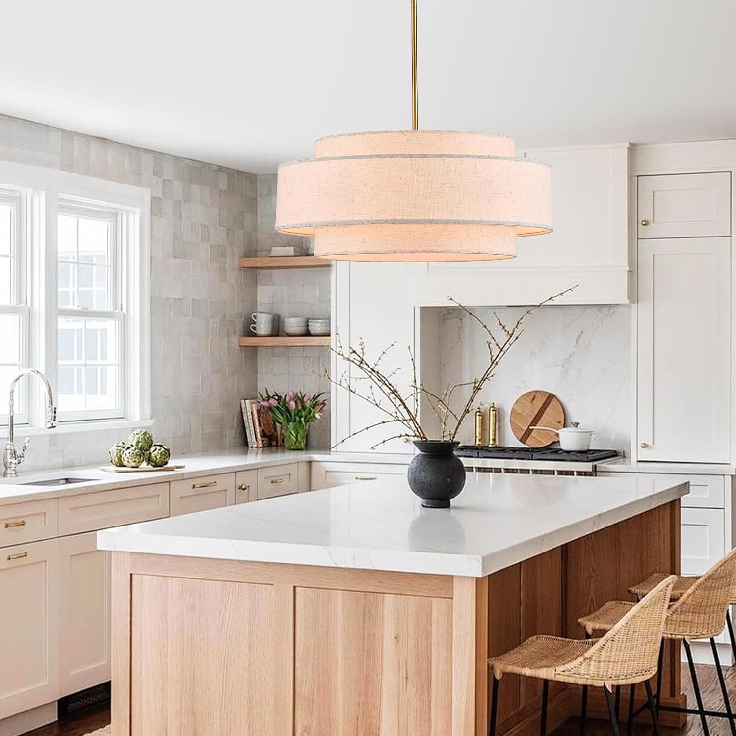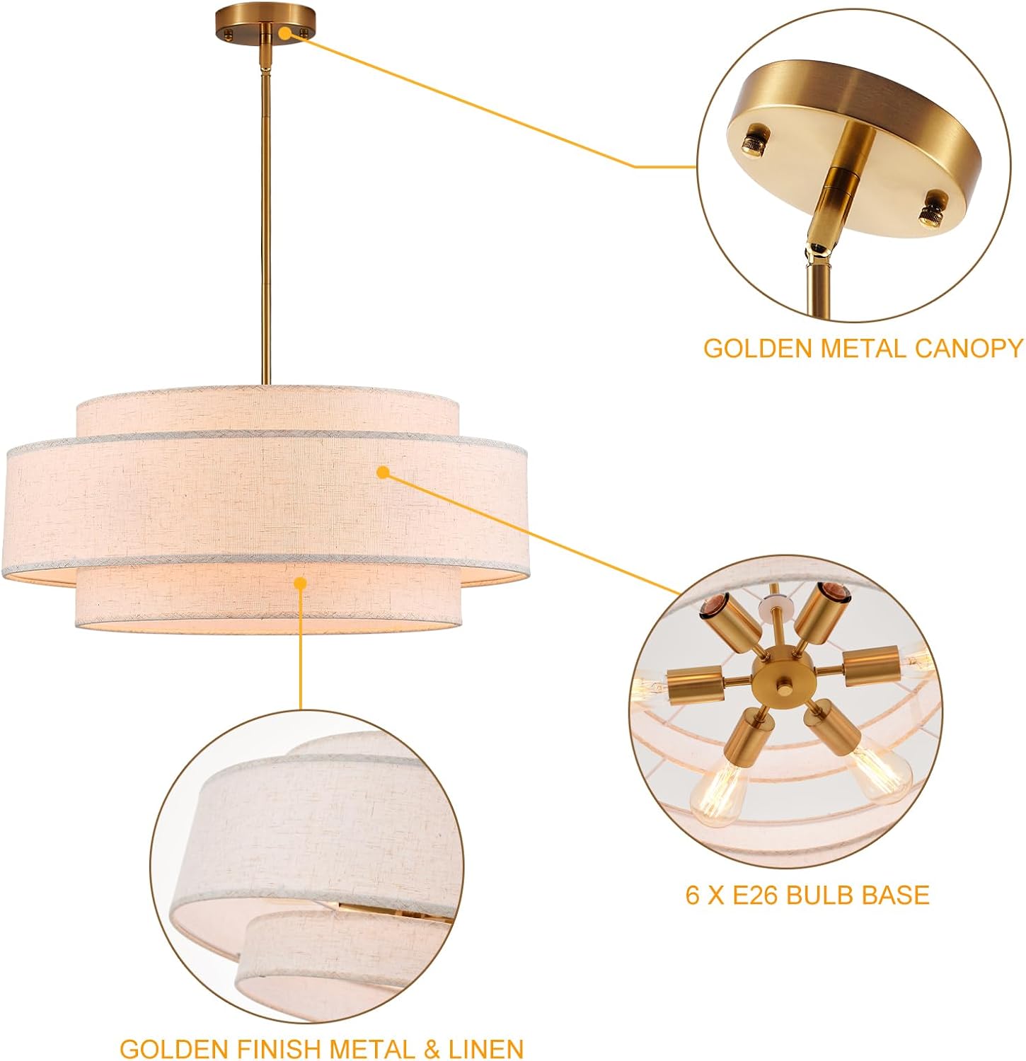 YOMECOO Modern 23.6″ Large Drum Chandelier 6-Lights Vintage Modern Chandelier Light Fixture with Linen Shade Retro Farmhouse Drum Chandeliers for Dining Room, Kitchen Island, Living Room, Bedroom